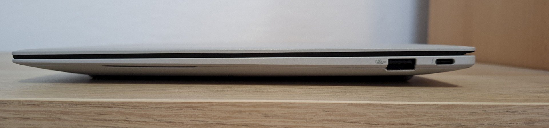 Po rozevření notebooku se před uživatelem objeví světlá spodní část v kontrastu s tmavou displejovou polovinou. Díky použití matného panelu je plocha s obrazovkou opticky takřka jednolitá, což tento kontrast ještě umocňuje. V horní hraně displeje se nachází webová kamera s infračerveným senzorem a krytkou objektivu.