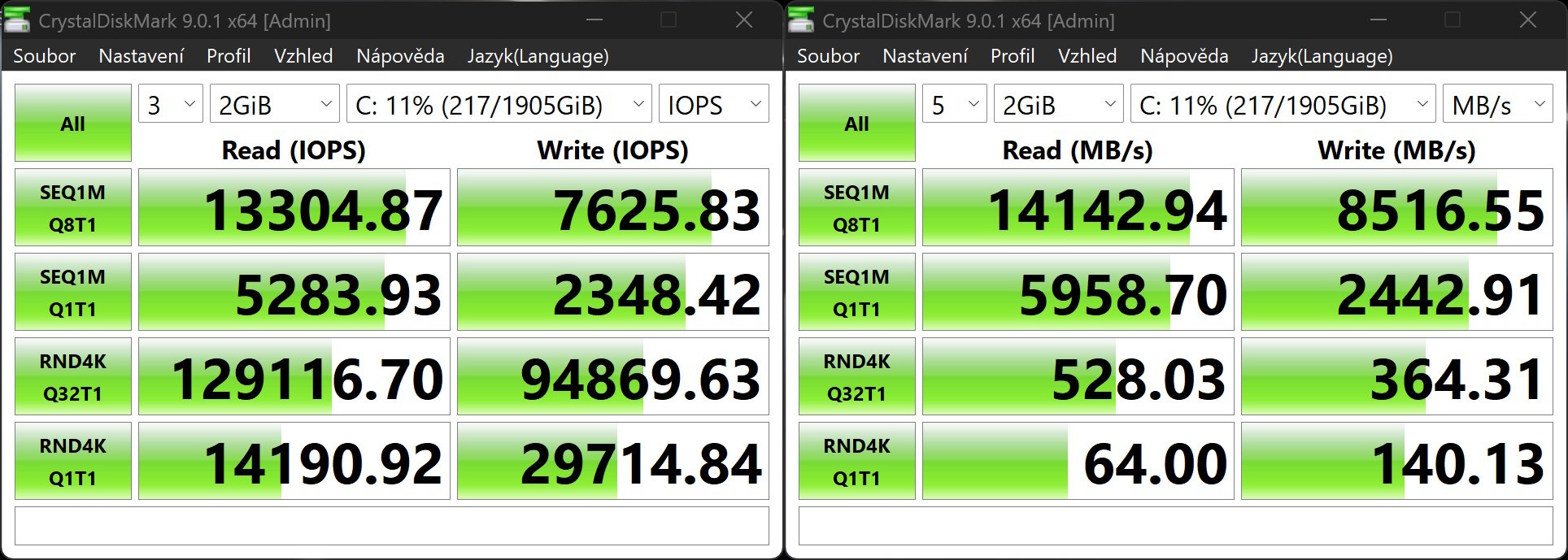 Testovaný notebook dále nabízel 32GB paměť RAM s výkonem 8 533 MT/s, která je pevnou součástí základní desky, a 2TB PCIe 5.0 SSD Samsung (MZVLC2T0HBLD-00BT7). I v tomto případě obě komponenty svým výkonem i kapacitou odpovídají high-endovému segmentu.