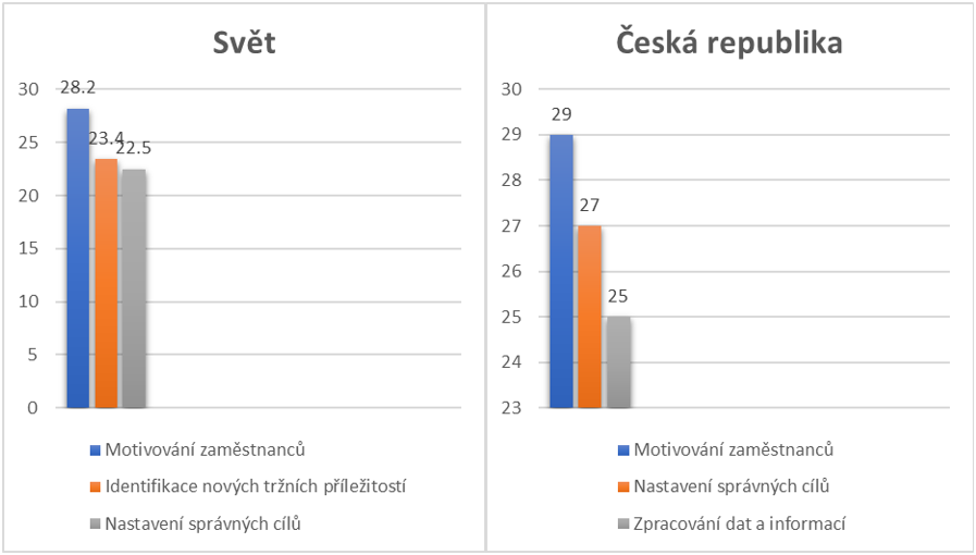 Zatímco potřeba motivování zaměstnanců a nastavení správných cílů je ve světě i v České republice více méně podobná, v ostatních zemích cítí mnohem větší potřebu investovat čas do nalezení nových tržních příležitostí. Čeští lídři se v tomto odlišují – tuto potřebu deklarovalo pouze 15 % z nich.