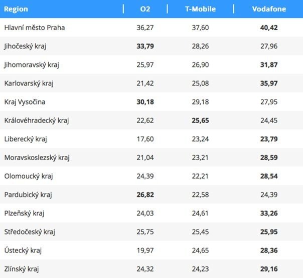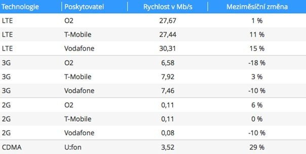 V roce 2016 si s rychlostí LTE internetu nejlépe vedl Vodafone. Červený operátor v porovnání s rokem 2015 zrychlil o 15 % na 30,3 Mb/s. Druhý je operátor O2, který byl v roce 2015 s rychlostí na prvním místě, od té doby jeho průměrná rychlost spíše stagnovala, naměřeno bylo 27,7 Mb/s. A poslední je růžový T-Mobile, který ovšem v roce 2016, stejně jako Vodafone, zrychloval, a to o 11 % na 27,4 Mb/s.