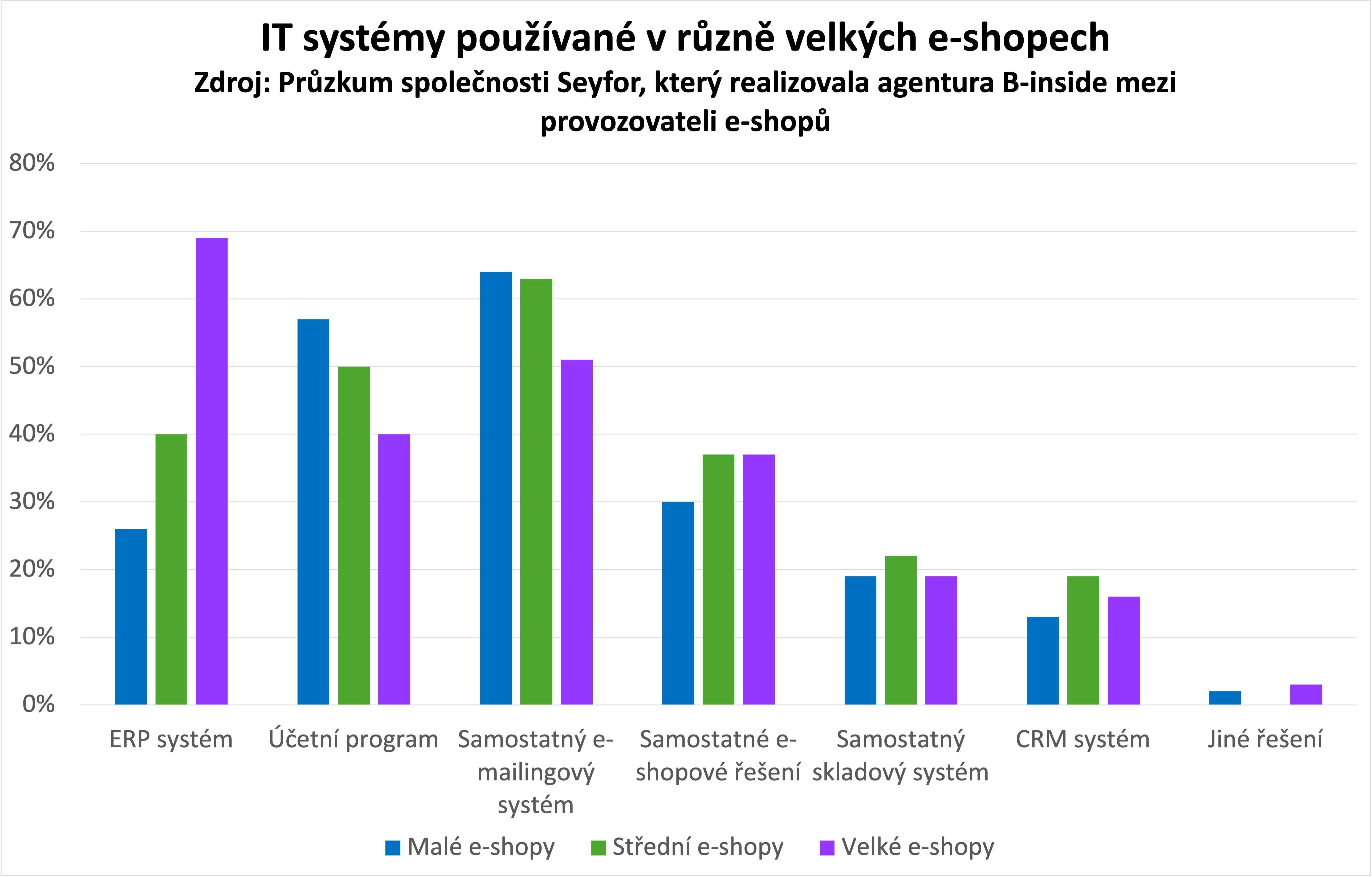 Data z průzkumu společnosti Seyfor ukazují, že technologické zázemí e-shopů se výrazně liší podle jejich velikosti. Zatímco menší e-shopy nejčastěji pracují s účetním programem a samostatným e-mailingovým nástrojem, u středních a velkých e-shopů se čím dál více prosazují komplexní podnikové informační systémy. Téměř 70 % velkých e-shopů dnes využívá ERP systém, který propojuje obchod, finance, sklad i další klíčové procesy do jednoho celku. U menších provozovatelů je tento podíl výrazně nižší, což odpovídá jednoduššímu provozu a menším nárokům na automatizaci.