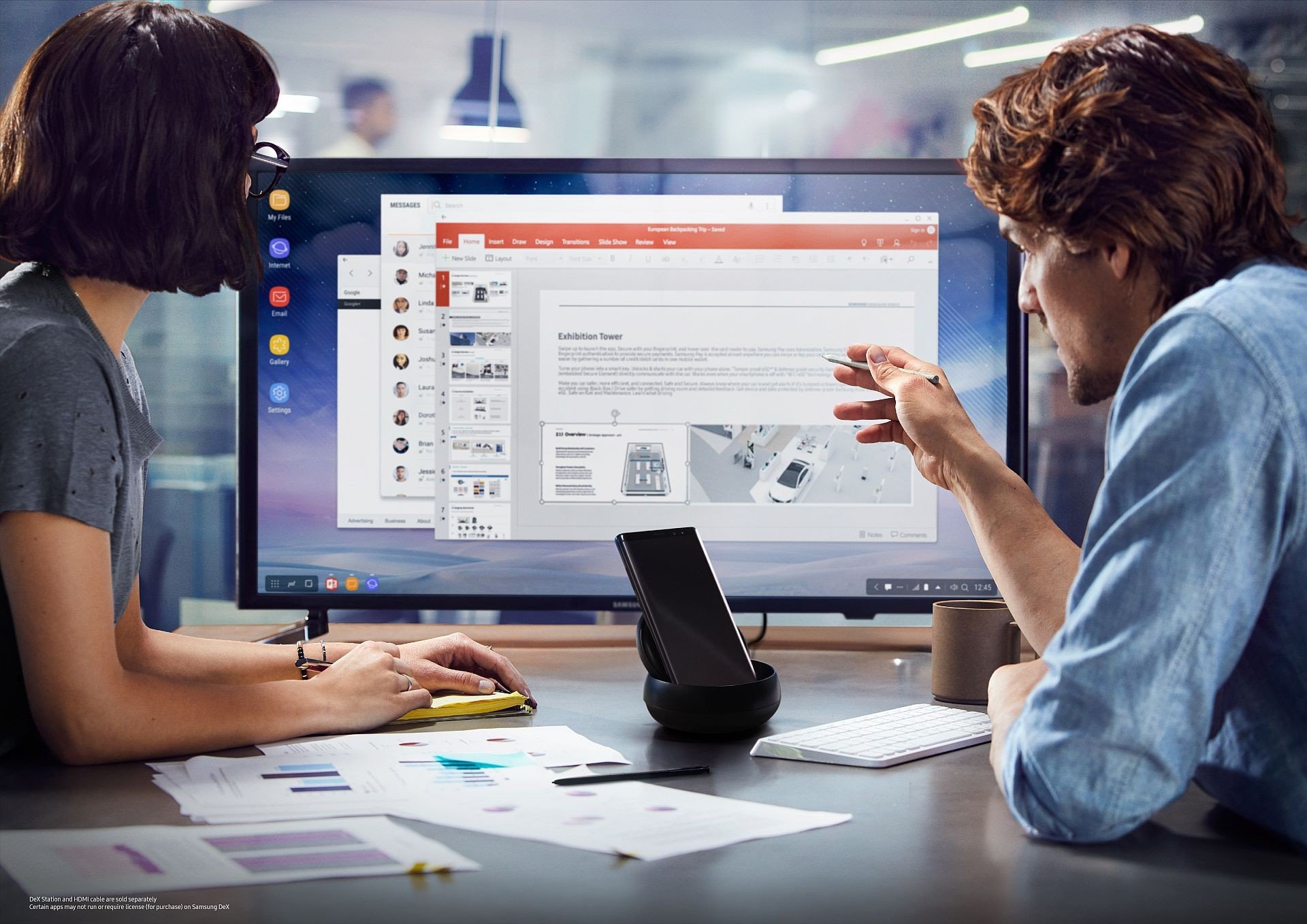 Po připojení monitoru, klávesnice a myši promění Samsung DeX chytrý telefon ve stolní počítač. S pomocí dokovací stanice Samsung DeX lze upravovat dokumenty, spouštět prezentace, hrát hry, komunikovat a prohlížet multimediální obsah přímo z telefonu na větší obrazovce.