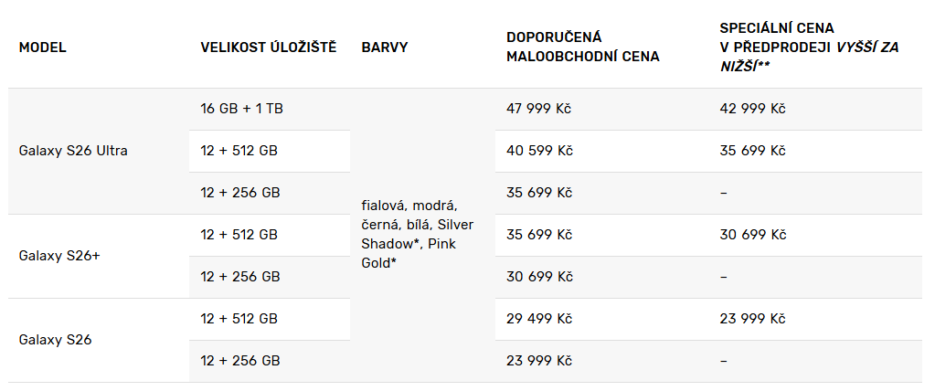 Telefony Galaxy S26 Ultra, S26+ a S26 se v České republice začnou prodávat 11. března 2026. Pokud jde o barevné varianty, mohou se zákazníci těšit na fialovou, modrou, černou a bílou. Na stránkách Samsungu lze získat i varianty Silver Shadow a Pink Gold.