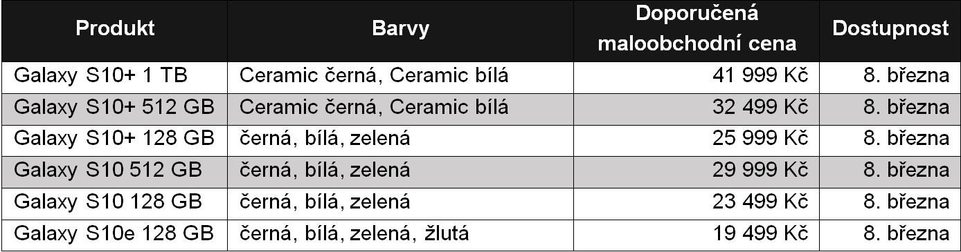Telefony Galaxy S10, Galaxy S10+ a Galaxy S10e budou k dostání od 8. března 2019. Ceny začínají na 23 499 Kč u Galaxy S10, 25 999 Kč u Galaxy S10+ a 19 499 Kč u Galaxy S10e. Příjem předběžných objednávek telefonů Galaxy S10, Galaxy S10+ a Galaxy S10e začne dnes 20. února 2019 ve 21:00. Pro období předobjednávek (20. 2. až 7. 3.) nabízí Samsung k modelům Galaxy S10 nebo Galaxy S10+ možnost zdarma získat bezdrátová sluchátka Galaxy Buds v hodnotě 3 999 Kč.