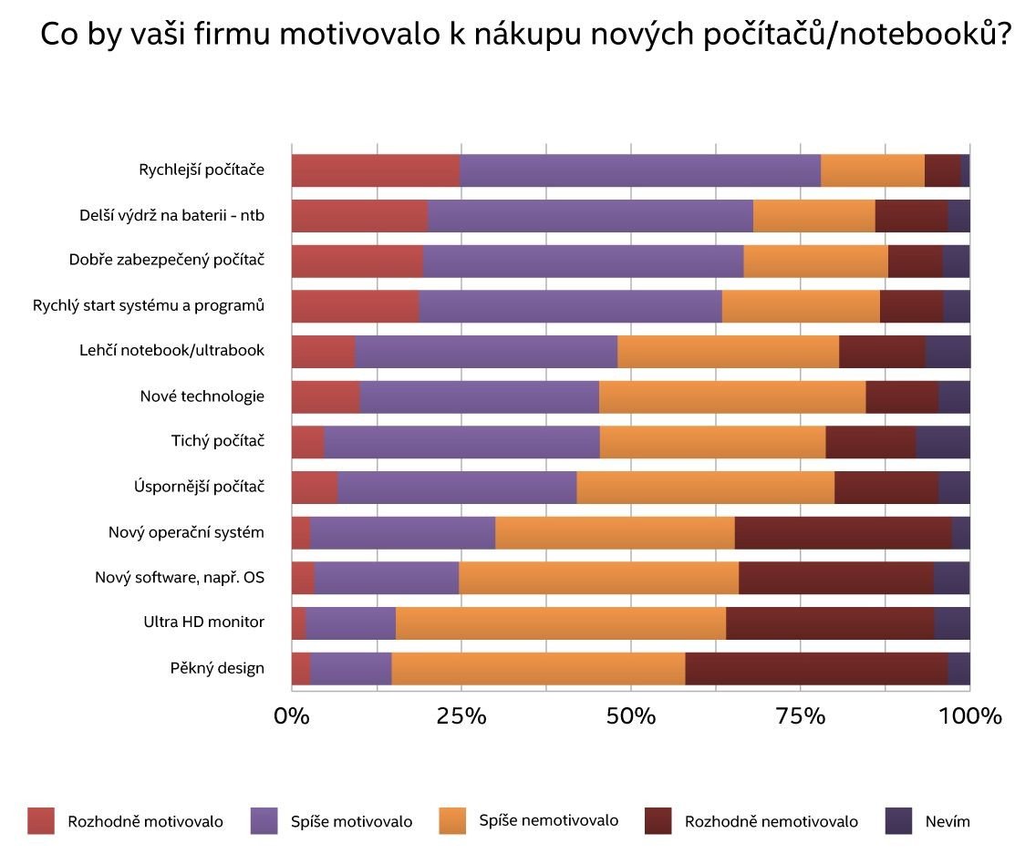 Největším motivátorem k nákupu nových počítačů či notebooků je pro 78 % českých (a dokonce 86 % slovenských) CIOs právě větší rychlost počítače. Následují delší výdrž na baterii (68 %) a dobře zabezpečený počítač (66,7 %).