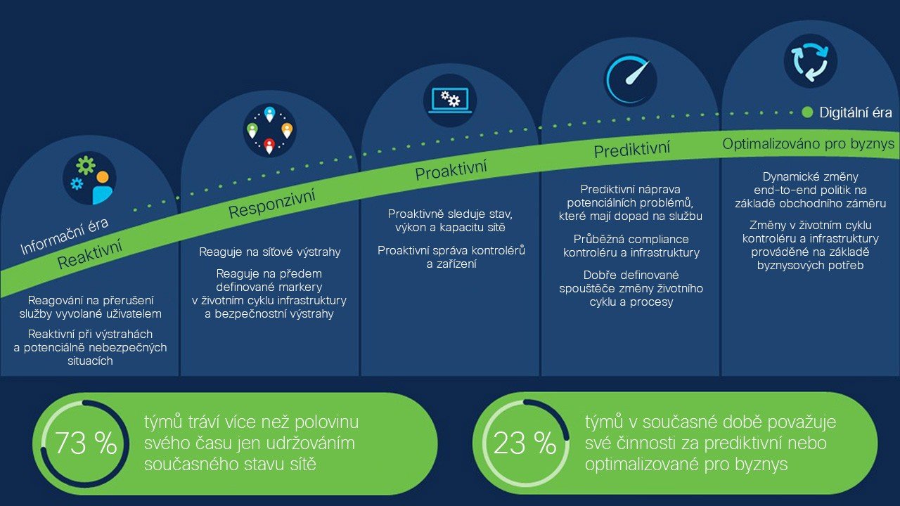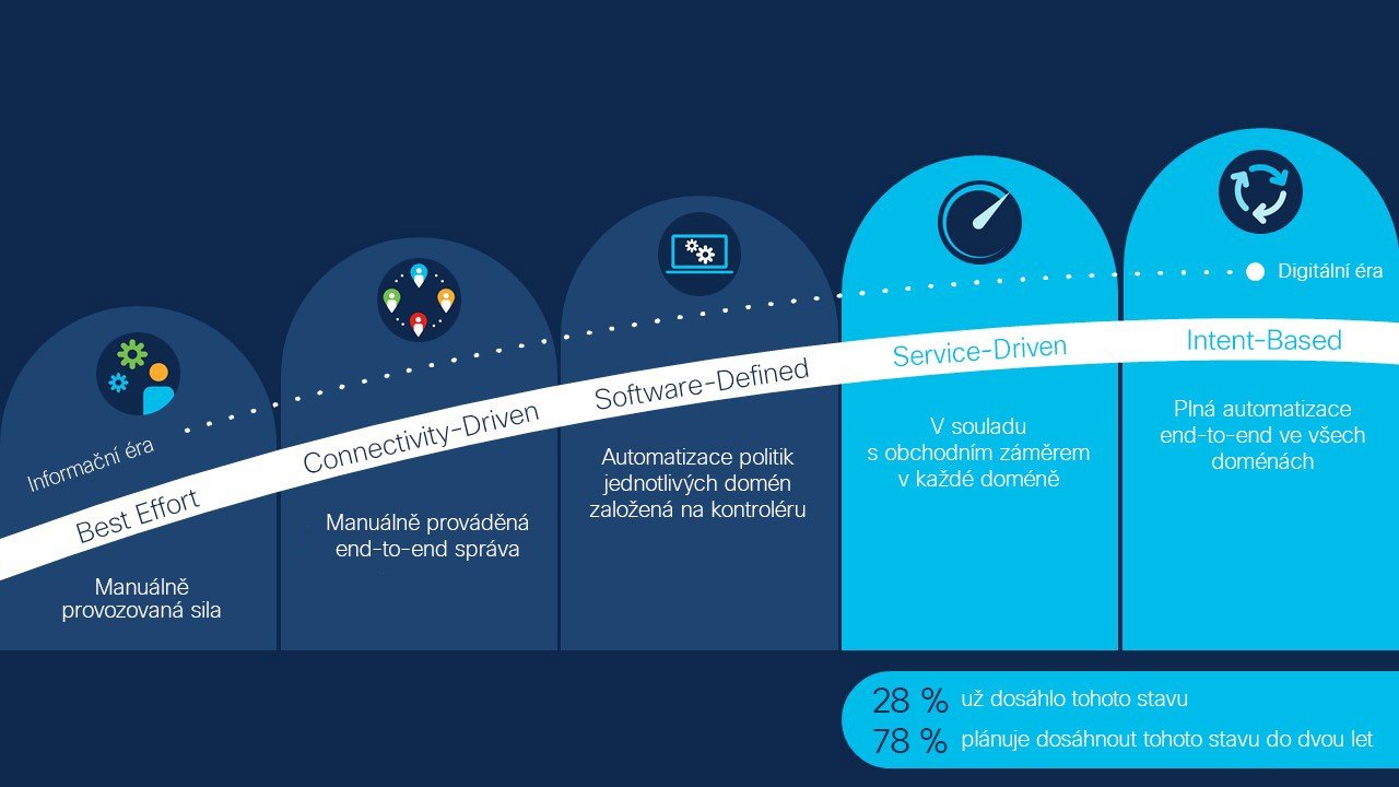 Způsob, jakým toho dosáhnout, je přechod na intent-based sítě. Některé firmy už mají tímto směrem nakročeno, 41 % dotázaných totiž má alespoň jednu instanci SDN v alespoň jedné ze svých síťových domén. Na druhou stranu pouze čtyři procenta firem tvrdí, že jejich sítě jsou již plně řízeny záměrem. Že tohoto stavu dosáhnou během příštích dvou let věří 35 % firem. Na otázku, kde v současnosti v Cisco Digital Readiness modelu figurují, pouze 28 % uvedlo, že jejich sít již překonala hranici softwarově definovaných sítí a je řízena obchodními potřebami nebo dokonce plně založena na záměru. Do dvou let chce tohoto stavu dosáhnout 78 % respondentů.