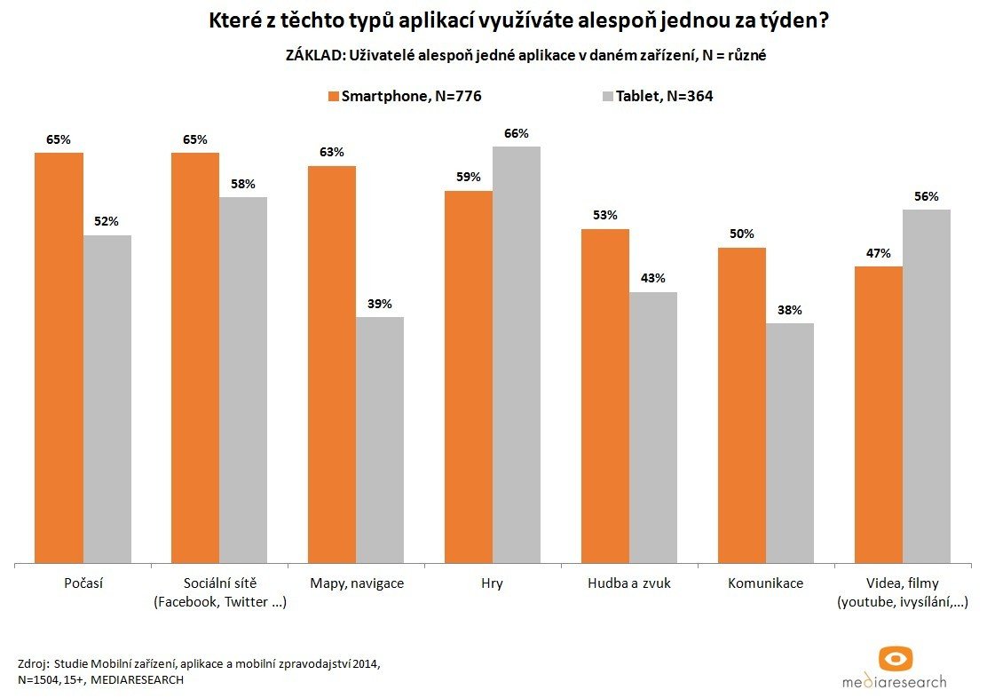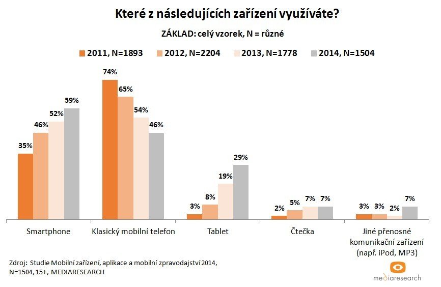 Výsledky vycházejí ze studie Mobilní zařízení, aplikace a mobilní zpravodajství 2014, kterou uskutečnila společnost Mediaresearch. Zúčastnilo se jí 1 504 respondentů z internetové populace Českého národního panelu starší 15 let.