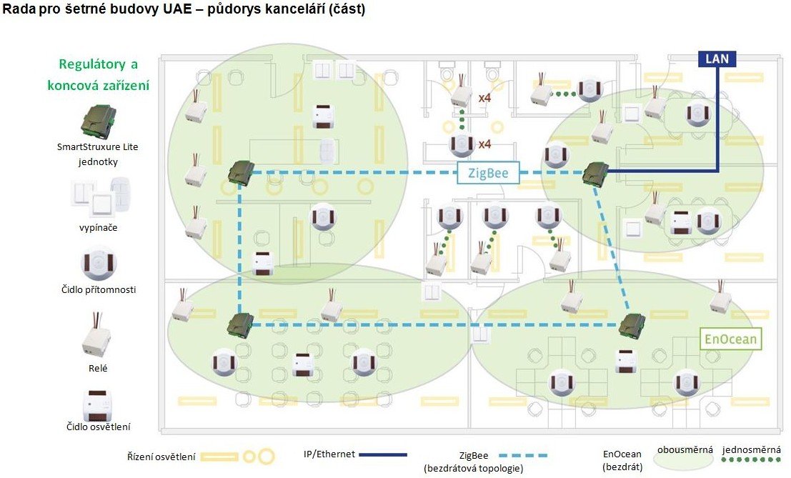 - Zelené zóny jsou řízeny pomocí SmartStruxure Lite regulátorů, které mohou odesílat a přijímat informace do i z okolních EnOcean koncových zařízení.