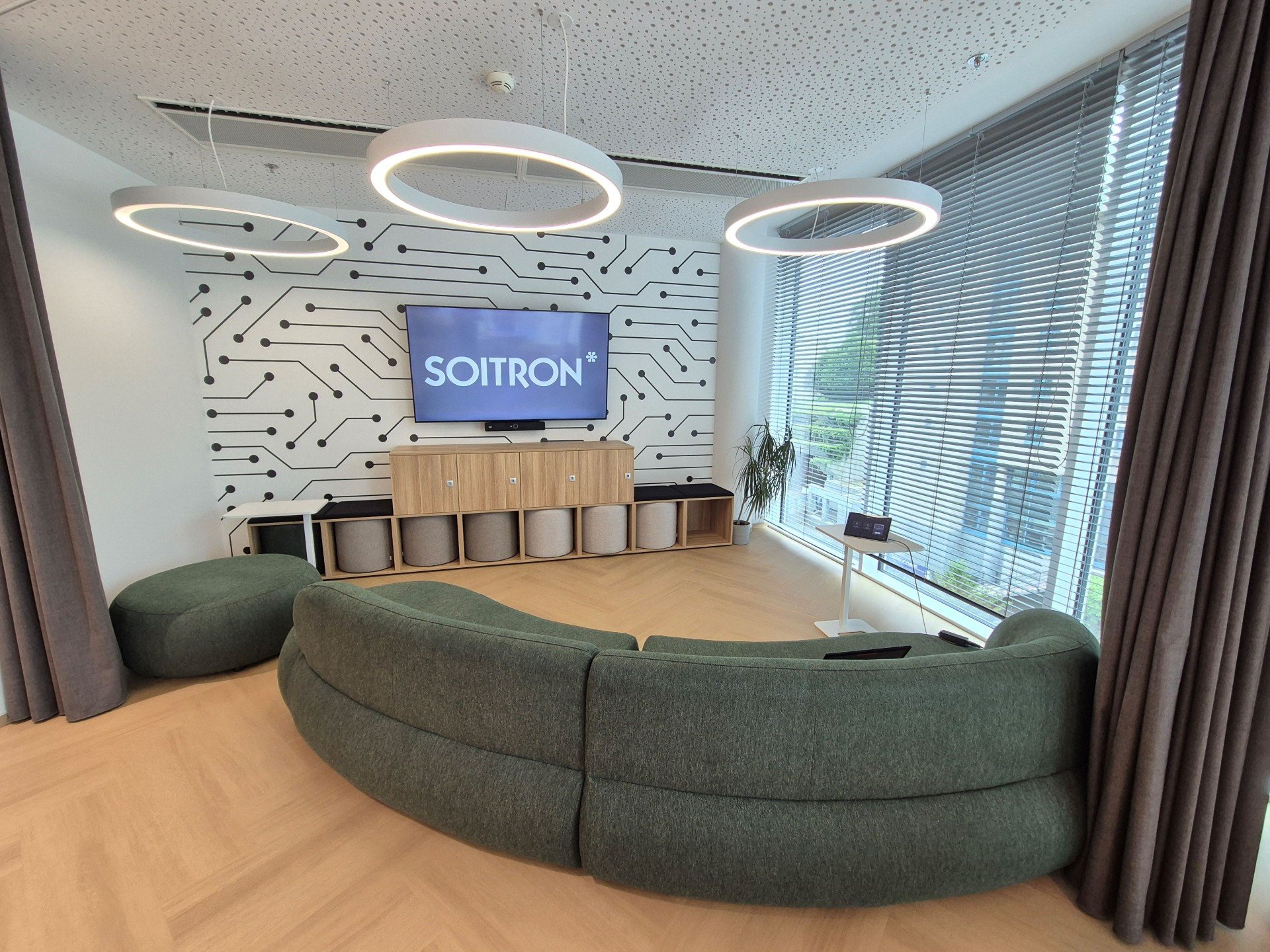 Nechybí prvky identity značky, například pro Soitron typický motiv hvězdy – ten se objevuje na stěnách, ve světelné stropní lince i v detailech interiéru. Kuchyňka s obývací zónou a barovým sezením zase podporuje neformální kontakt mezi zaměstnanci.