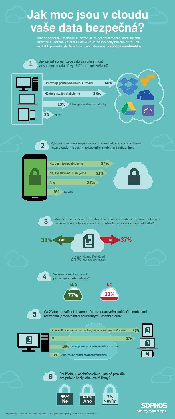 Průzkum „Mobilní bezpečnost ve světě cloudů“ provedený společností Sophos ukázal, že 84 % organizací umožňuje nějakou formu přístupu z firemních zařízení ke cloudovým službám pro sdílení souborů, jako je například Dropbox. Nicméně ale 65 % respondentů data přenášená mezi cloudem a mobilním zařízením nijak nešifruje. Překvapující je i to, že za bezpečné považuje sdílení firemních souborů nebo spolupráci nad sdílenými daty při současném využití cloudů a mobilních zařízení pouze 38 % dotázaných.