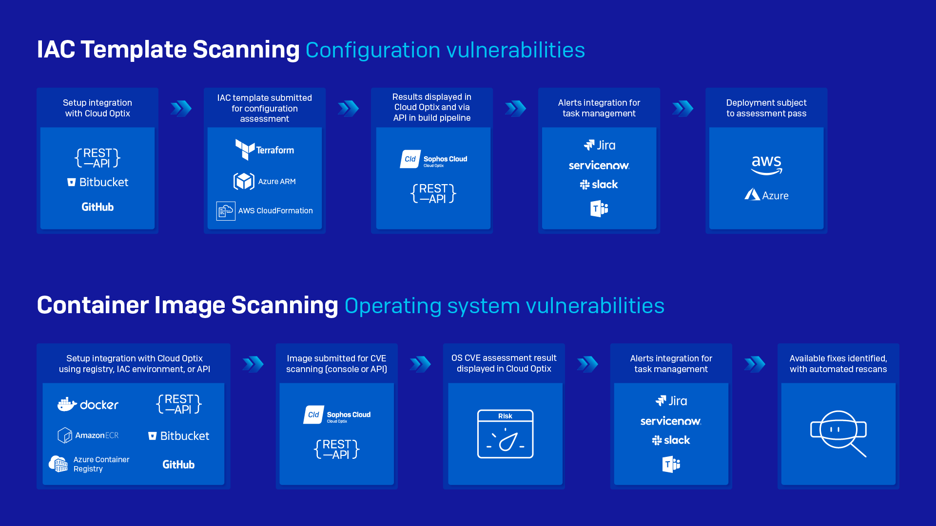 Sophos Cloud Optix je SECaaS cloudová platforma nové generace, která s využitím umělé inteligence poskytuje nepřetržitý bezpečnostní monitoring, kontrolu dodržování předpisů, analytiku a nápravná opatření napříč multi-cloudovým prostředím. Nově je nyní platforma Sophos Cloud Optix rozšířena o skenování obrazů kontejnerů a nabízí: