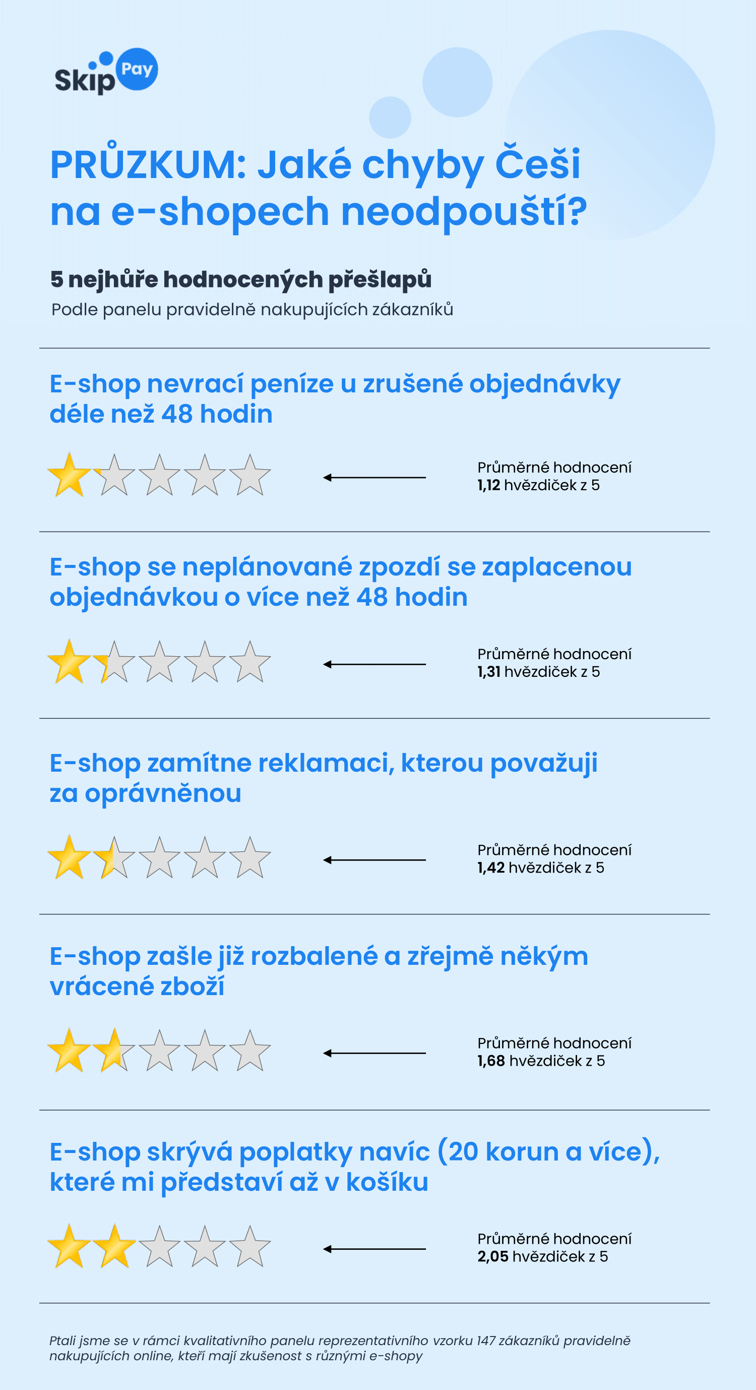 Bez většího překvapení jsou hlavním adeptem na výrazný pokles průměrného hodnocení momenty, kdy jde o peníze zákazníků. Například ve chvíli, kdy zákazník zruší objednávku a e-shop neumí rychle vrátit již zaplacenou částku (hodnocení 1,12 hvězdiček) nebo tehdy, kdy se bez ohlášení zpozdí s doručením již uhrazené objednávky (hodnocení 1,31 hvězdiček). Na třetím místě se s 1,42 hvězdičkami umístí i e-shopy, které zamítnou reklamaci považovanou zákazníkem za oprávněnou.