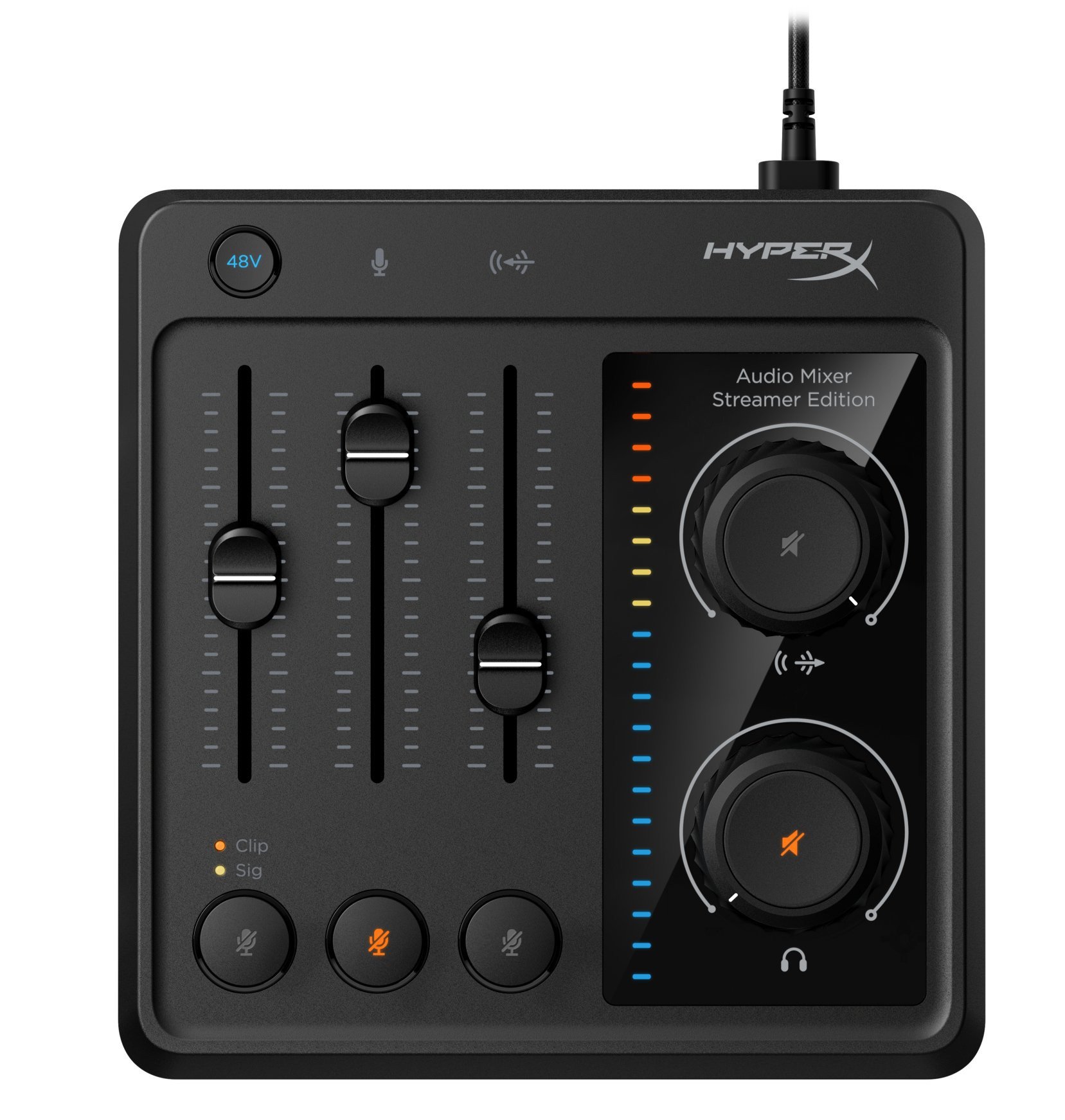 Audio Mixer Audio Interface: HyperX Audio Mixer Audio Interface je kompaktní řešení „vše v jednom“, které umožňuje tvůrcům obsahu dosáhnout vhodného mixu pro mikrofon, herní zvuk, hlasový chat a výstupní hlasitost. Audio mixer zajišťuje zvuk studiové kvality díky funkcím, jako je vstup XLR s fantomovým napájením 48 V, podpora 24bitového/96kHz zvuku a přímé monitorování. Má uživatelsky přívětivé ovládací prvky, včetně ovladačů úrovně pro všechny tři zvukové vstupy, ovladačů hlasitosti pro linkové a sluchátkové výstupy a tlačítek pro ztlumení vstupů a výstupů. Připojit lze různé mikrofony a zdroje zvuku, upravovat hlasitost jednotlivých zdrojů a monitorovat zvuk v reálném čase. Audio mixér je kompatibilní s počítači PC a Mac a nabízí jednoduché připojení plug and play, k jehož používání není nutný žádný software.
