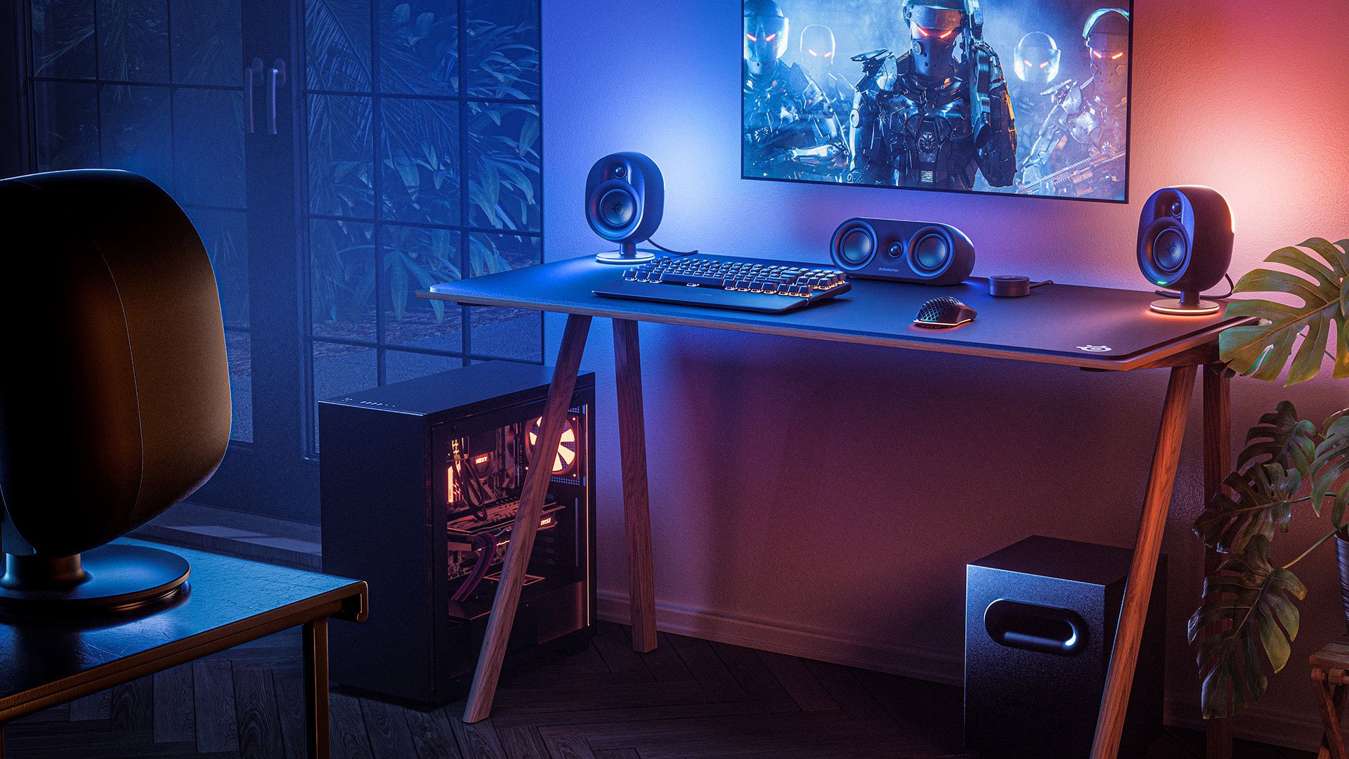 Velcí herní nadšenci se chtějí maximálně ponořit do hry také tím, že hru cítí a vidí kolem sebe. Tento pocit jim zprostředkuje set reproduktorů Arena 7. Jde o 2.1 sestavu se dvěma dvoupásmovými reproduktory a jedním 6,5" subwooferem směřujícím dolů a vytvářejícím silnou odezvu - bohatou, hlubokou a přesnou reprodukci nízkých frekvencí. Čtyřzónové RGB podsvícení lze plně přizpůsobit, reaguje na měnící se barvu monitoru nebo hudbu a umocňuje atmosféru herního doupěte. Připojení k PC, Mac nebo konzoli PlayStation zajišťuje USB-C, ale k dispozici je také optický vstup/výstup a standardní 3,5mm jack konektor pro připojení telefonu, tabletu, televize a dalších audio zařízení. Zároveň lze využít Bluetooth.