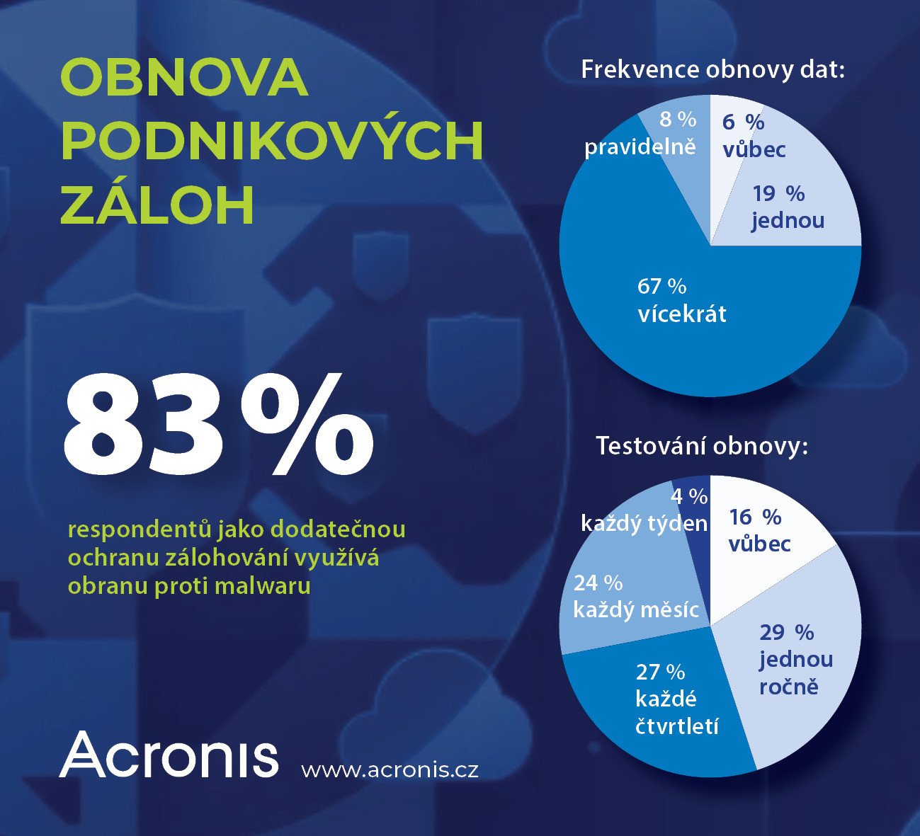- 16 % respondentů netestuje obnovu ze zálohy vůbec a 29 % testuje jen jednou ročně. Každé čtvrtletí pak 27 %, každý měsíc pak 24 % a každý týden 4 % oslovených.