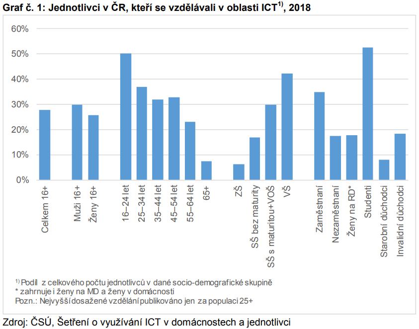 V roce 2018 rozvíjelo své digitální znalosti téměř 28 % obyvatel České republiky starších 16 let. „Počítačové dovednosti si častěji zdokonalují muži než ženy, konkrétně 30 procent mužů a více než čtvrtina žen. Vzdělávání v oblasti ICT však klesá s rostoucím věkem. Nejvyšší zájem o něj mají mladí lidé mezi 16 až 24 lety, kde je to každý druhý. U seniorů se vzdělává pouze sedm procent z nich,“ uvedla k výsledkům analýzy Alena Hykyšová z odboru statistik rozvoje společnosti ČSÚ.