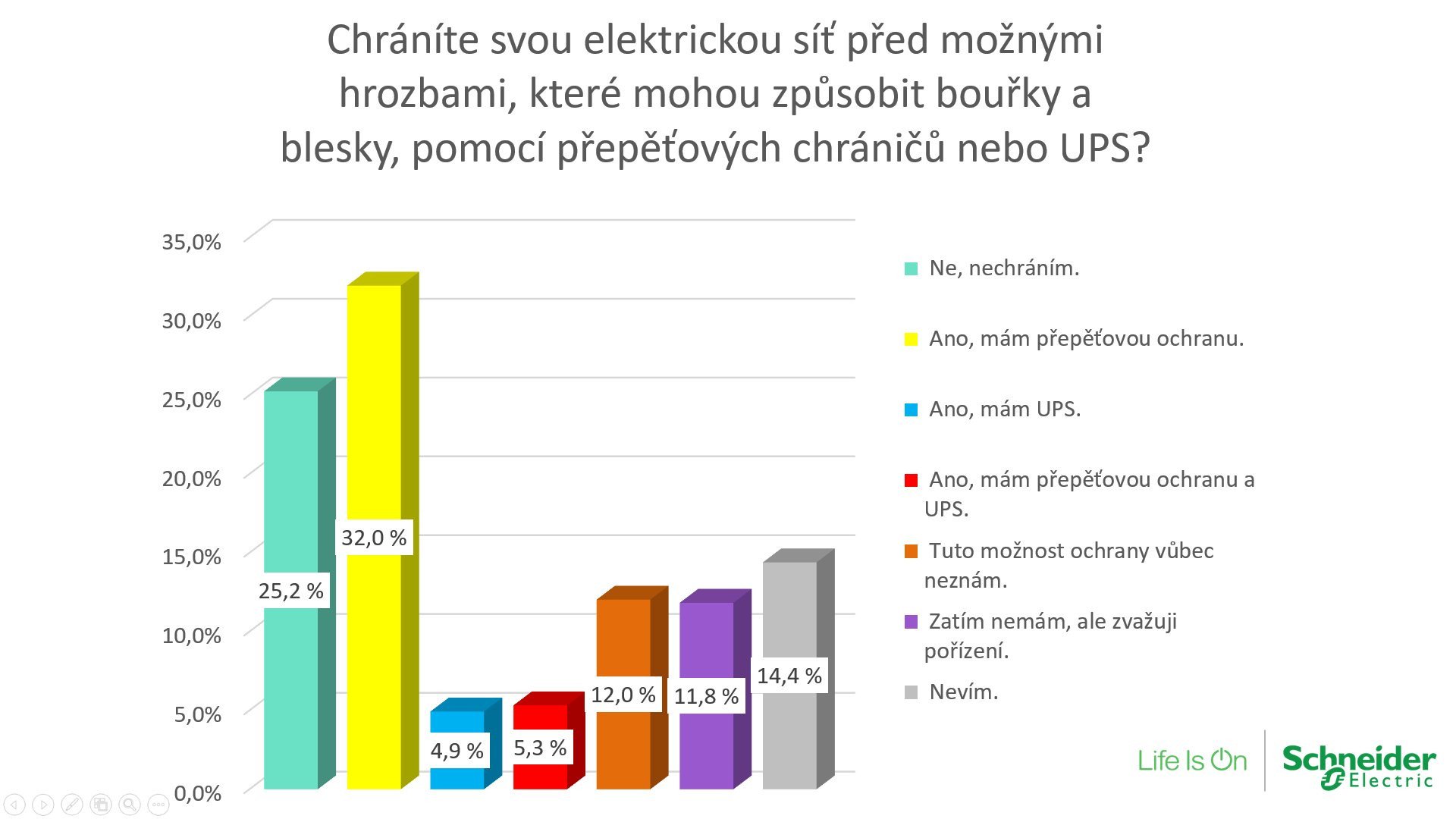 Výrazně méně Čechů, jen pět procent, používá Uninterruptible Power Supply (UPS), tedy záložní zdroje. Zatímco přepěťová ochrana zabezpečí síť před kolísáním napětí, UPS poslouží v případě, že proud vypadne úplně. Záložní zdroj je zařízení, které udržuje v chodu připojená zařízení, a umožňuje je tak několik minut napájet i při výpadku proudu, což je nesmírně důležité a brání to například ztrátě důležitých dat. Uživatel má tak čas uložit rozpracované soubory v počítači a přístroj standardně vypnout. Dalších pět procent respondentů je naopak velmi opatrných a doma mají nainstalovanou jak přepěťovou ochranu, tak právě i UPS.