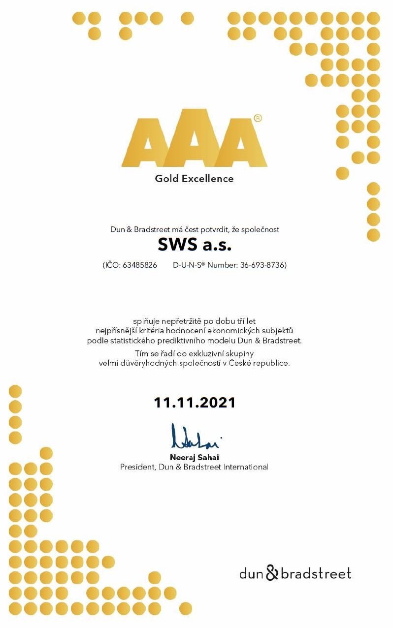 Společnost SWS dosáhla prestižního ocenění AAA Gold podle mezinárodně uznávaných kritérií obchodně – analytické společnosti Dun & Bradstreet. Tohoto exkluzivního ocenění dosahují pouze společnosti s nejvyšším hodnocením AAA nejen aktuálně, ale i historicky tři roky v řadě.