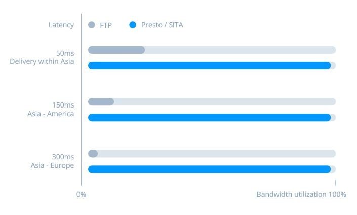 Díky technologii SITA (Synology Internet Transfer Accelerator) dokáže služba Presto File Server překonávat běžné problémy zahrnující vysokou latenci a nestálé připojení při přenosu souborů na velké vzdálenosti pomocí jiných protokolů, jako například FTP nebo HTTP, a zvýšit přenosovou rychlost při doručování rozsáhlých dat do vzdálených cílů.