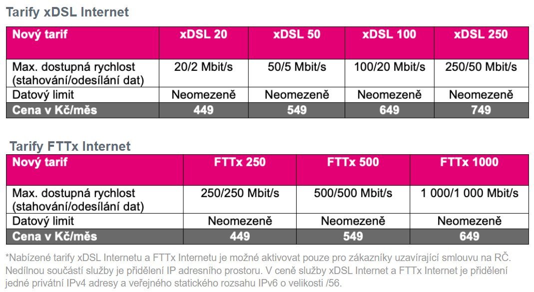 Změny se dotknou i tarifů Pevného internetu. Nové tarify xDSL a FTTx přinášejí výrazné zjednodušení nabídky. Stávající zákazníci Pevného internetu budou v listopadu převedeni na aktuální tarify, které byly uvedeny v minulém roce. Z původních 16 zůstane v rezidentní nabídce sedm tarifů: xDSL Internet s rychlostmi 20, 50, 100, 250 Mbit/s, dále také FTTx Internet 250, 500, 1 000 Mbit/s.