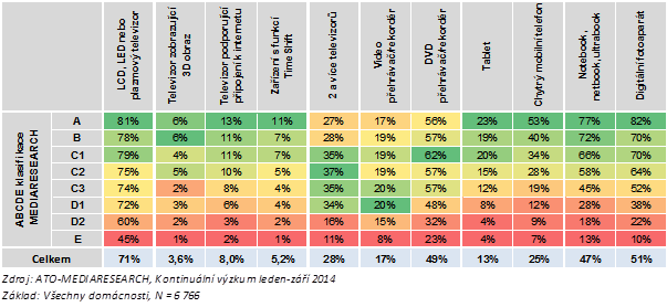 Aktuálním hitem na poli mediálních zařízení jsou mobilní zařízení, především smartphony a tablety. Procento českých domácností vlastnících tablet se za poslední rok zdvojnásobilo, z 6,4 % na více než 13 %. Chytrý mobilní telefon se nachází ve čtvrtině českých domácností. Právě vlastnictví tabletu nebo chytrého telefonu lze označit jako příznak příslušnosti k vyšší socioekonomické skupině. Tablet resp. smartphone vlastní ve skupině A celých 23 % resp. 53 % domácností, zatímco ve dvou nejnižších kategoriích D2 a E jen 4 % resp. 8 % domácností. Podobně strmý profil podle socioekonomického žebříčku má ještě vlastnictví televizorů s moderními funkcemi (Smart TV, 3D televize, time-shift). Nižší socioekonomické skupiny také stále zaostávají např. ve vlastnictví notebooků a digitálních fotoaparátů.