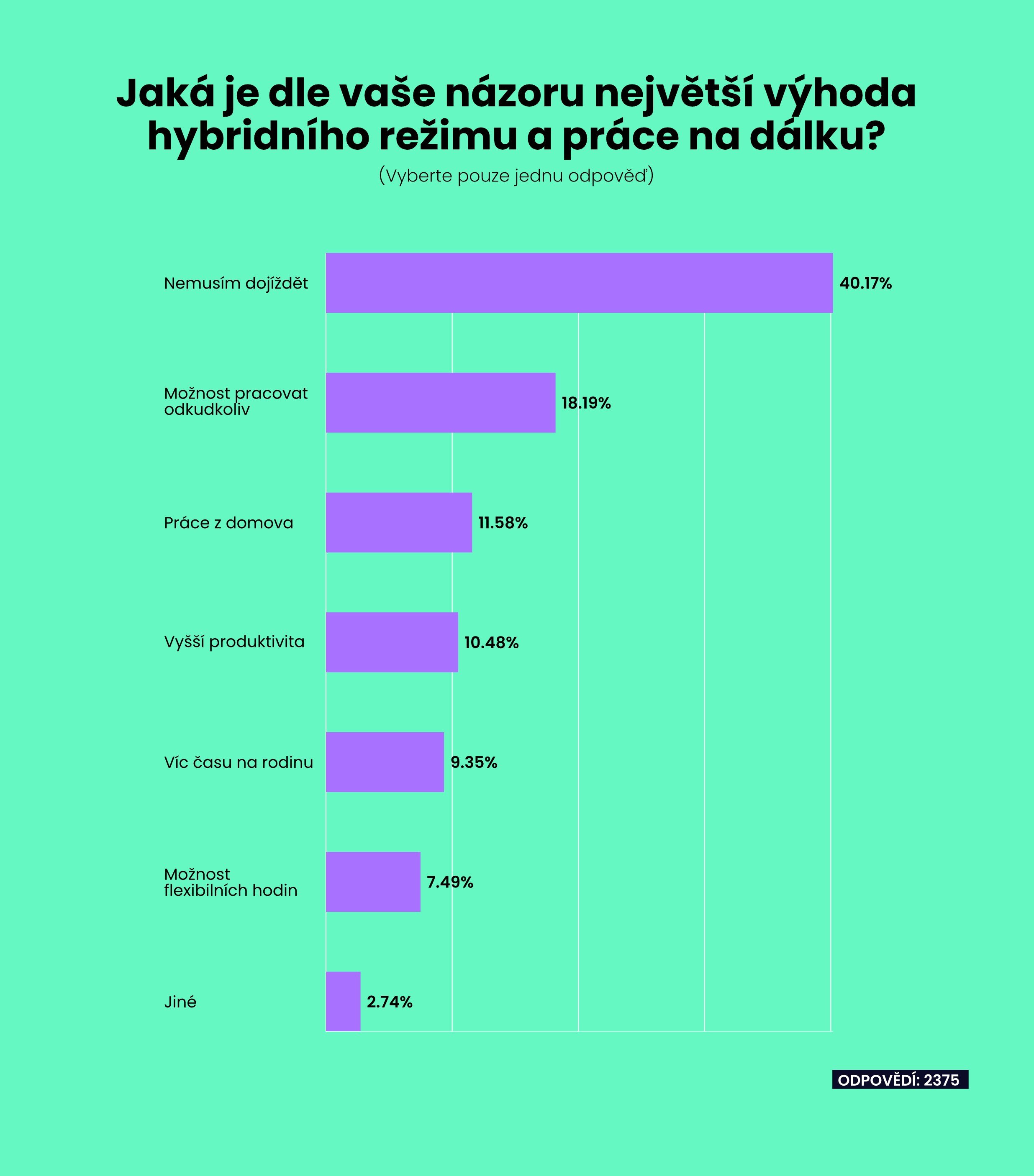 V odvětví IT není práce na dálku novým tématem. Využívá se, protože je to s danou pracovní náplní možné, ale i proto že má tento pracovní model své výhody. Nejčastěji uváděným benefitem je vylepšení takzvaného „well-beingu“, tedy duševní a fyzické pohody pracovníků, což v průzkumu potvrdilo na 63 % respondentů. Více než čtvrtina lidí nezaznamenala změnu k lepší ani horšímu, což se dá v turbulentní době náhlých změn a restriktivních opatření považovat za pozitivní. Jen 9,7 % lidí zaznamenalo zhoršení.