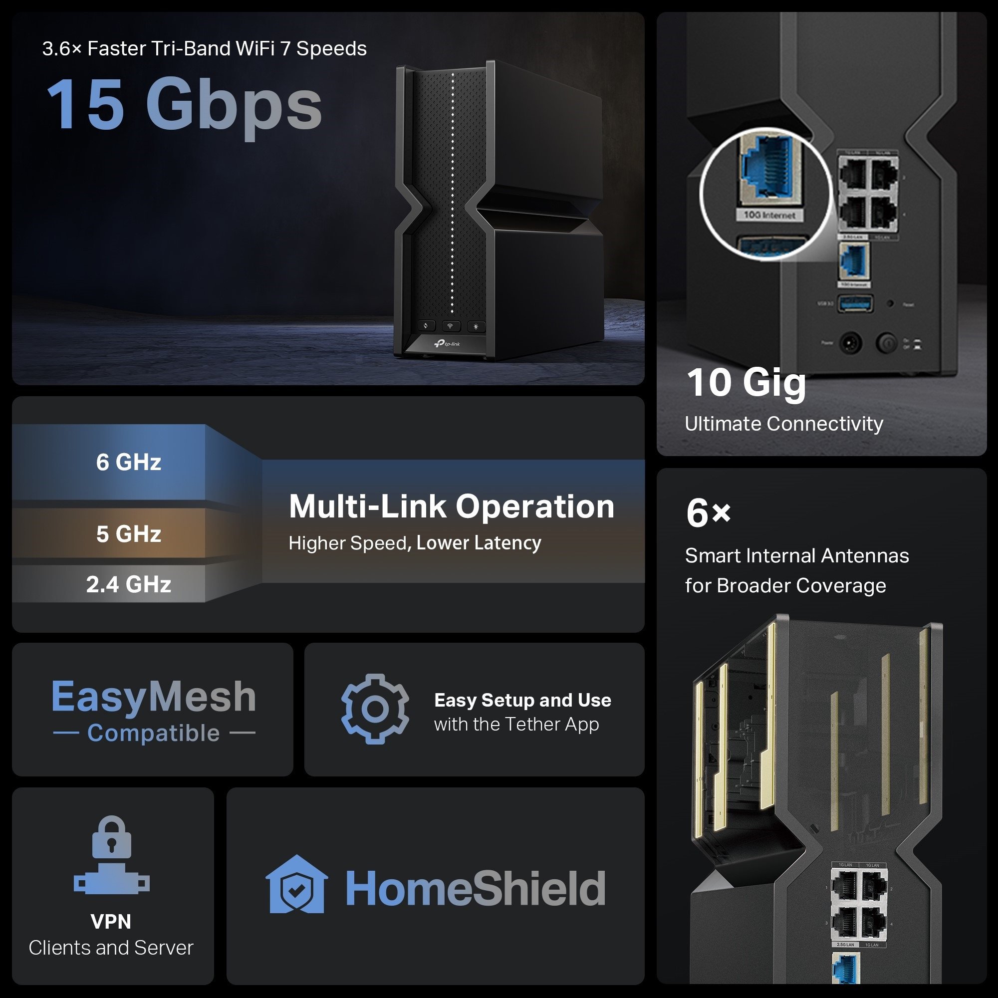 Archer BE700 je vybaven jedním 10Gb/s WAN/LAN portem (RJ45/SFP+ combo), jedním 2,5Gb/s LAN portem, třemi 1Gb/s LAN porty a portem USB 3.0 pro sdílení souborů v síti. Nastavení a správa probíhá jednoduše přes mobilní aplikaci TP-Link Tether nebo webové rozhraní. Router podporuje také VPN server/klient (OpenVPN, PPTP, L2TP, WireGuard), IPv6, QoS podle zařízení a řadu dalších pokročilých funkcí.