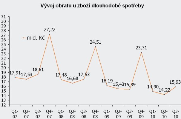 Pokles obratu v sektoru spotřební elektroniky se ve třetím čtvrtletí v meziročním srovnání zpomalil na 6 % i díky tomu že v loňském roce bylo třetí čtvrtletí již výrazně slabší vlivem nastupující krize. Celkový vývoj za první tři čtvrtletí je ovšem stále velmi negativní s meziročním poklesem o 14 %. K oživení trhu došlo hlavně u klíčového segmentu, plochých televizorů, který v hodnotovém vyjádření začal ve třetím čtvrtletí vykazovat mírný meziroční nárůst. V rámci plochých televizorů roste váha technicky pokročilejších modelů, tj. Full HD, 100/200Hz a LED přístrojů. Nicméně obrat ostatních produktových skupin i přes určité zpomalení stále meziročně klesá, což způsobilo celkový pokles obratu spotřební elektroniky.