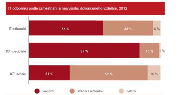 V roce 2009 bylo mezi IT odborníky poprvé více těch, kteří měli terciární vzdělání, jednalo se o 48 % proti 44 % středoškolsky vzdělaných. Do roku 2012 se zastoupení vysokoškolsky vzdělaných osob v populaci IT odborníků dále zvyšovalo až na 56 % (74 tis.).