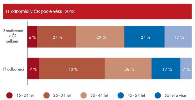 V roce 2012 bylo mezi IT odborníky zaměstnáno nejvíce osob ve věkové skupině 25–34 let. IT odborníků v této věkové skupině bylo téměř 53 tis. a tvořili 40 % všech IT odborníků. Naopak nejméně jich bylo v nejstarším věku, tzn. ve věku 55 a více let (9 tis.). Podobné zastoupení jako nejstarší věková kategorie má nejmladší generace, což může souviset s narůstajícími požadavky na znalosti, tzn. jejich delší setrvání v procesu vzdělávání a oddálení nástupu do zaměstnání. Ve srovnání s věkovým složením všech zaměstnaných v ČR lze konstatovat, že IT odborníci jsou podstatně mladší.
