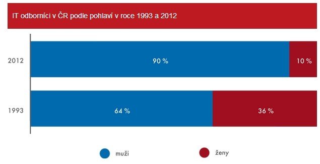 Zcela podle očekávání mají mezi IT odborníky dominantní postavení muži, kteří v roce 2012 tvořili 90 %. Takto výraznou převahu však muži vždy neměli. V roce 1993 bylo mezi IT odborníky totiž 36 % žen, v absolutní hodnotě se jednalo o 22 tis. žen. Do roku 2012 tak nekleslo pouze jejich relativní zastoupení, ale také jejich absolutní počet (13 tis. v roce 2012). Tento výrazný pokles počtu žen mezi IT odborníky lze pravděpodobně připisovat mimo jiné i rychlému rozvoji informačních technologií a tím i zvýšeným nárokům na rozvoj znalostí spojený s časem a flexibilitou zaměstnaných.