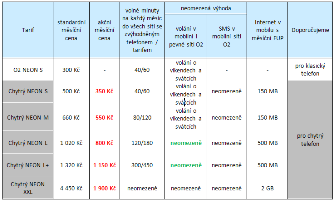 Zároveň O2 myslí i na zákazníky, kteří chytrý telefon zatím nemají, a nabízí jim tarif Neon S bez internetu v mobilu. S neomezeným voláním v mobilní a pevné síti O2 o víkendech a svátcích a se 60 volnými minutami pro volání do všech sítí vyjde na 300 Kč měsíčně.