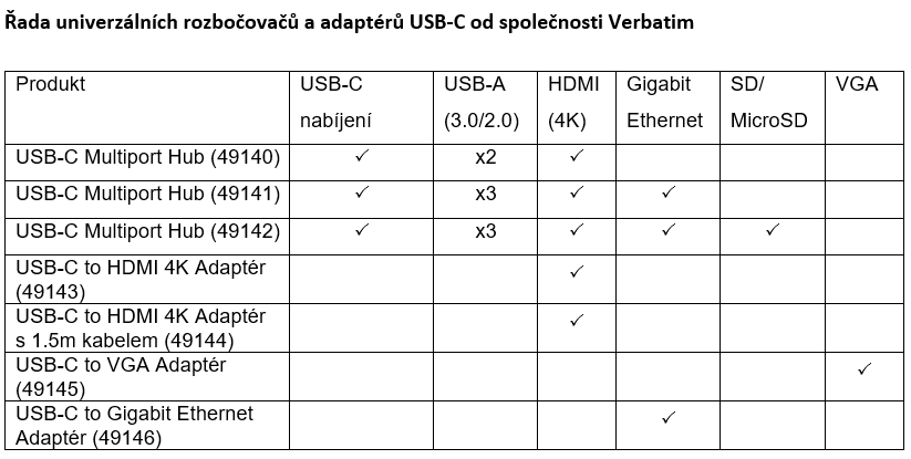 Víceportové USB-C rozbočovače poskytují více možností připojení. Například nejkomplexněji vybavený rozbočovač společnosti Verbatim (49142) nabízí tři porty USB 3.0, napájecí port USB-C, port HDMI pro připojení k displejům s vysokým rozlišením (4K), gigabitový ethernetový port pro připojení ke kabelovým sítím a SD/microSD. Kompletní řadu Verbatim rozbočovačů pak doplňují modely s různou kombinací portů založených na uživatelských preferencích, jak je uvedeno v tabulce níže.