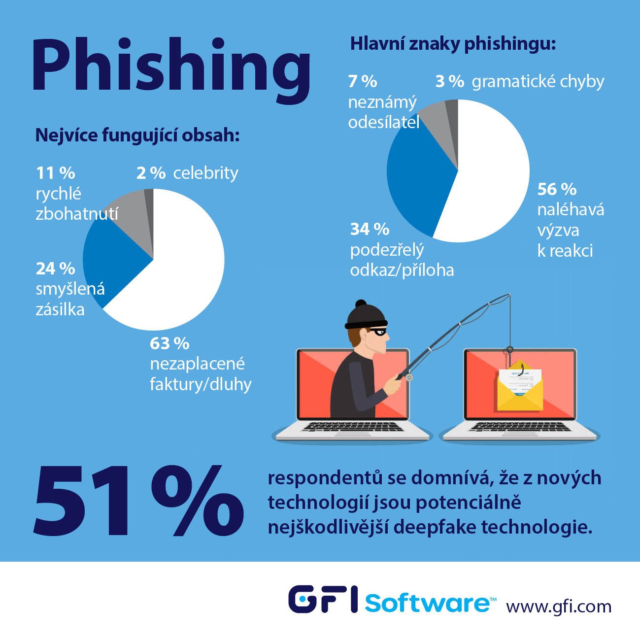 Podle dotazování mezi českými a slovenskými partnery společnosti GFI Software mají největší potenciál způsobit finanční škody krádeže přístupových údajů a cílené podvržené e-maily (BEC/Spear Phishing). Jednu z hlavních rolí hrají phishingové e-maily schopné oklamat firemní uživatele řadou podvodných informací včetně nezaplacených faktur, vymyšlených dluhů či neexistujících zásilek.