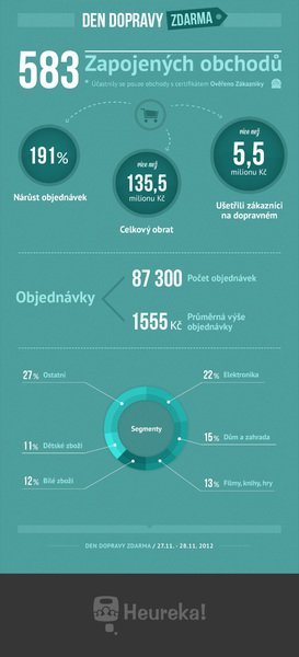 Od úterního do středečního poledne probíhala akce Den dopravy zdarma, kterou zákazníkům nabídlo 583 českých e-shopů. Čeští zákazníci akci využili nad všechna očekávání a počet objednávek se zvýšil oproti stejnému období minulého týdne o 191 %. V zapojených obchodech lidé utratili 135,5 milionu korun.