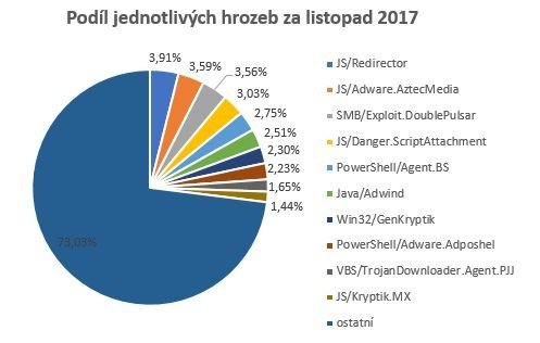 Nejčetnější internetovou hrozbou v ČR byl v listopadu trojský kůň JS/Redirector. Tento škodlivý kód automaticky přesměrovává internetový prohlížeč napadeného zařízení na stránky, odkud uživatel může stáhnout do svého počítače další druhy malwaru.