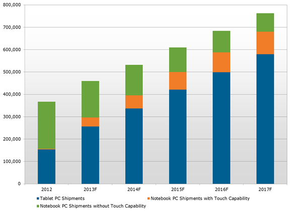 Prodej mobilních zařízení by se měl do roku 2017 zvýšit až na 762,7 milionu kusů ročně s tím, že za největším nárůstem by měly stát zejména dotykové produkty. Většinu těchto zařízení by měly tvořit tablety, které budou postupem času stále více nahrazovat notebooky.