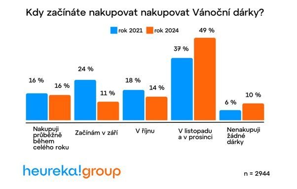 Až v listopadu, kdy je vánoční sezóna už v plném proudu, nakupuje vánoční dárky nejvíce lidí. Mnohem více než třeba před dvěma lety. Vyplývá z velkého vánočního průzkumu nákupního rádce Heureka.cz. Nakoupit vánoční dárky během listopadu a prosince letos plánuje rovná polovina respondentů, přitom ještě před dvěma lety to byla “jen” třetina.