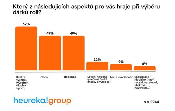 Nejčastější počet lidí, které plánujeme letos obdarovat je 5–10, což uvedla polovina respondentů, třetina jich dá dárky maximálně čtyřem lidem. A na co při výběru dárků nejčastěji hledíme? Nejdůležitější je pro zákazníky kvalita produktu a to, že výrobek dlouho vydrží, to uvedlo 62 % dotazovaných. Následují shodně cena (49 %) a recenze (49 %). Do rozhodování ale vstupuje i to, zda jde o lokální produkt (12 %).