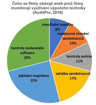 Mezi další důvody monitoringu informačních technologií patří zamezení plýtvání firemními zdroji (25 %) a zahálka zaměstnanců (17 %). Až na chvostu se v průzkumu umístily obavy z nezákonného chování zaměstnanců (10 %), například stahování pirátského obsahu do počítače, a zneužívání firemního majetku (8 %) pro soukromou potřebu.