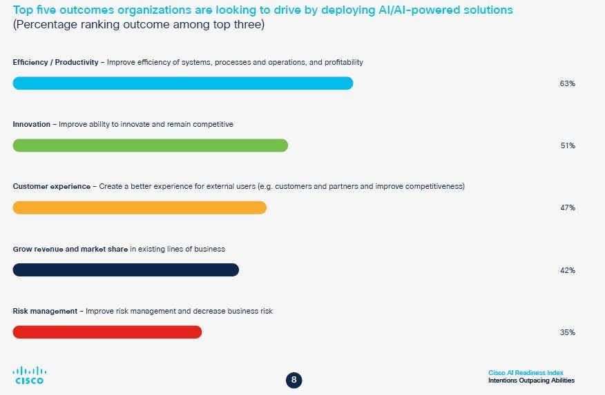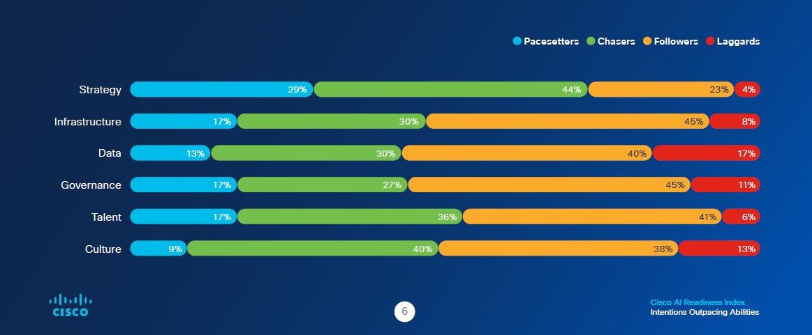 V celkovém hodnocení se pouze 14 % firem dostalo na úroveň Pacesetters/plně připravených, 48 % společností dostalo nálepku Followers/středně připravených a čtyři procenta firem nejsou na zavedení AI nachystána vůbec. „Celosvětová studie Cisco ukázala, že více než polovina firem není na AI připravena. V Česku je situace pravděpodobně ještě horší a rychle na tom asi nic nezmění ani přání vlády udělat z AI jednu ze strategických oblastí rozvoje,“ uvedl technický ředitel české pobočky Cisco Pavel Křižanovský.