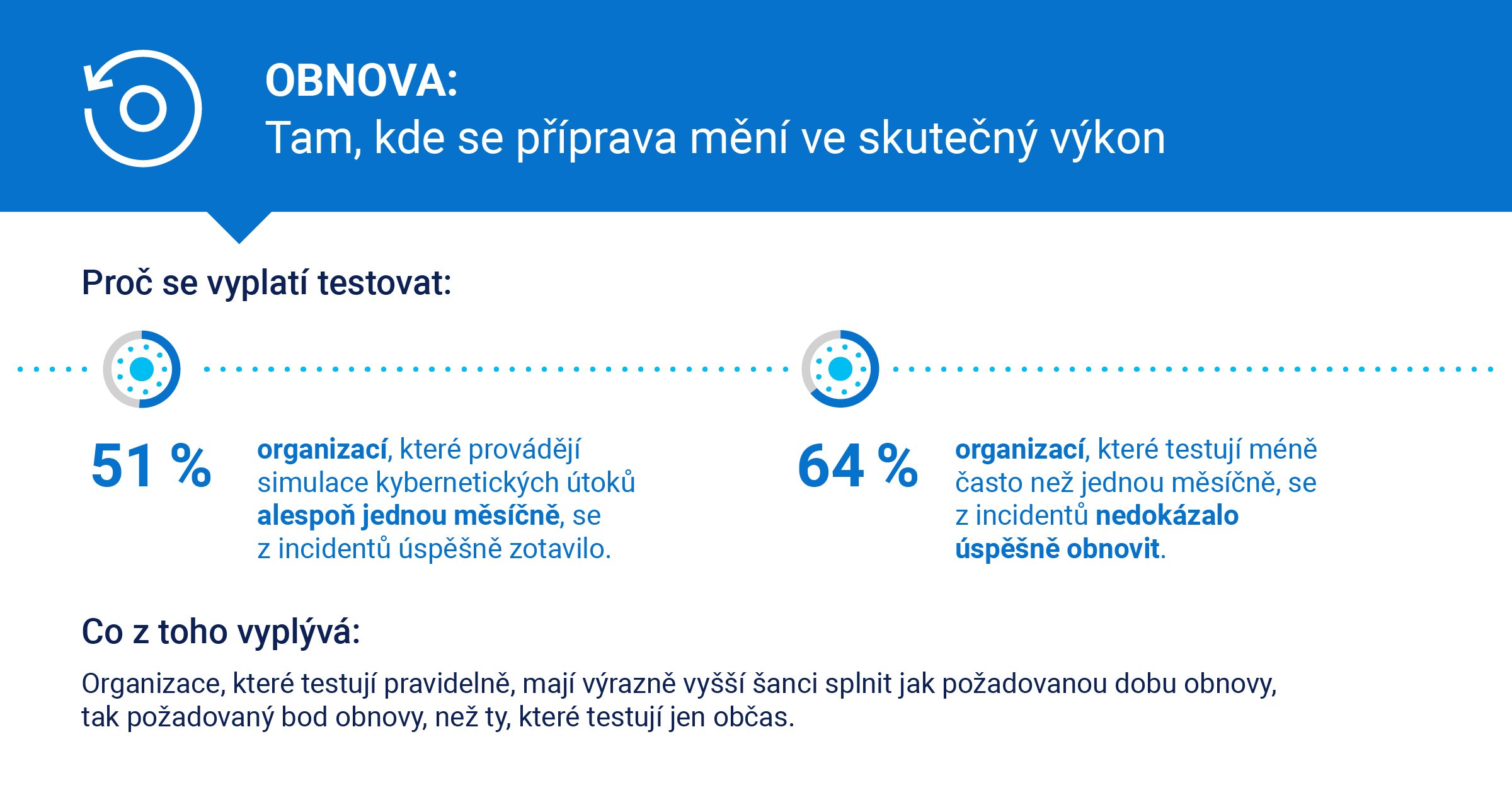 Z globálních dat také vyplývá, co nejčastěji dluh vůči kybernetické odolnosti prohlubuje. Jedním z důležitých faktorů je pravidelné testování obnovy. Pro region EMEA platí, že podle průzkumu přibližně polovina organizací, které každý měsíc nebo častěji provádějí simulované kybernetické útoky, uvedla, že se dokázala z incidentů úspěšně zotavit.