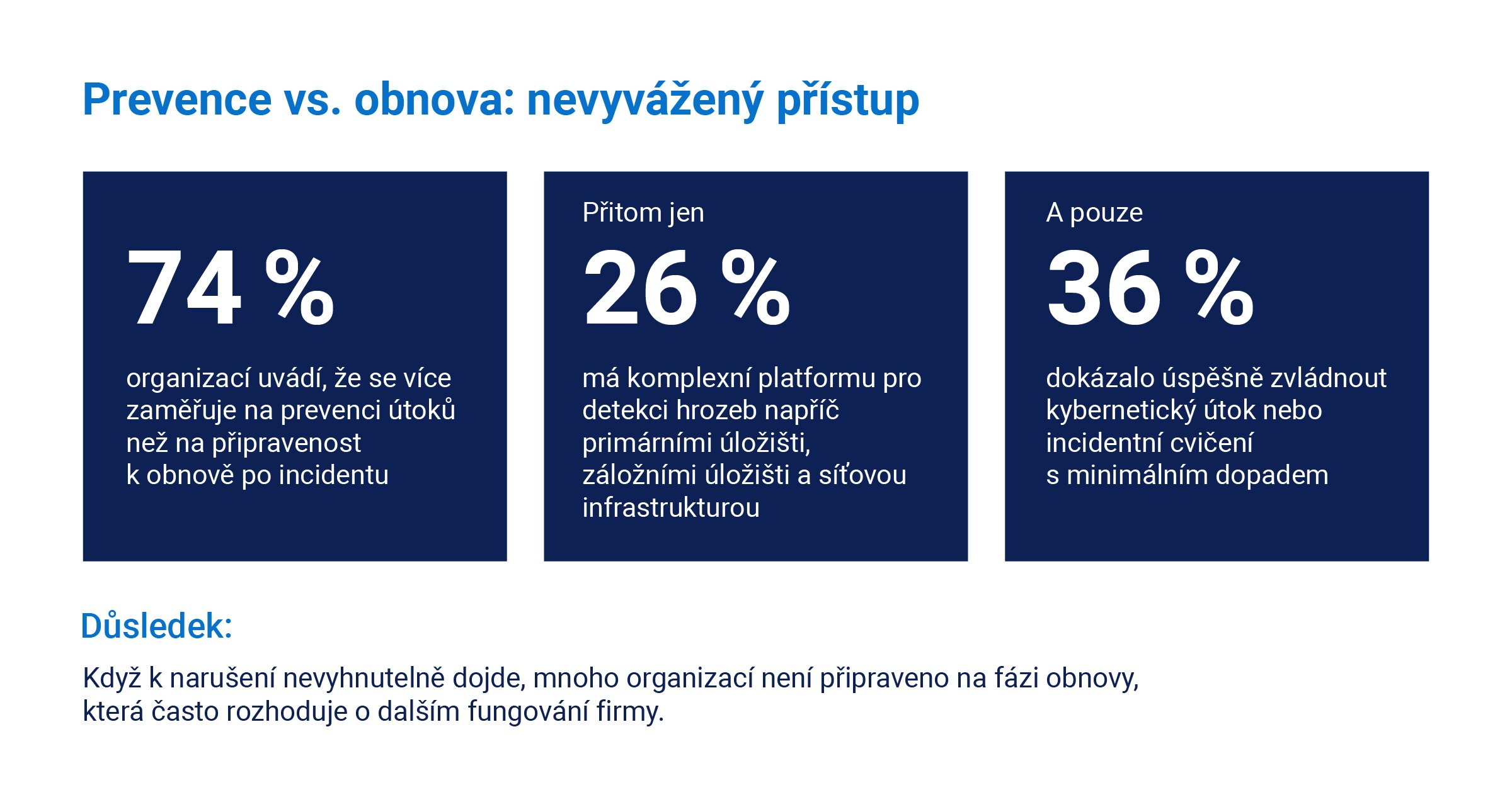 Téměř tři čtvrtiny respondentů (74 %) uvedly, že se podle nich jejich organizace více soustředí na předcházení útokům než na přípravu na obnovu po incidentu. Zároveň zhruba čtvrtina (26 %) uvedla, že jejich organizace má robustní detekci hrozeb napříč primárním úložištěm, zálohami a sítí. Pro region EMEA také platí, že 43 % účastníků průzkumu připustilo, že jejich zálohy nejsou chráněné v takové míře, jako by měly být.