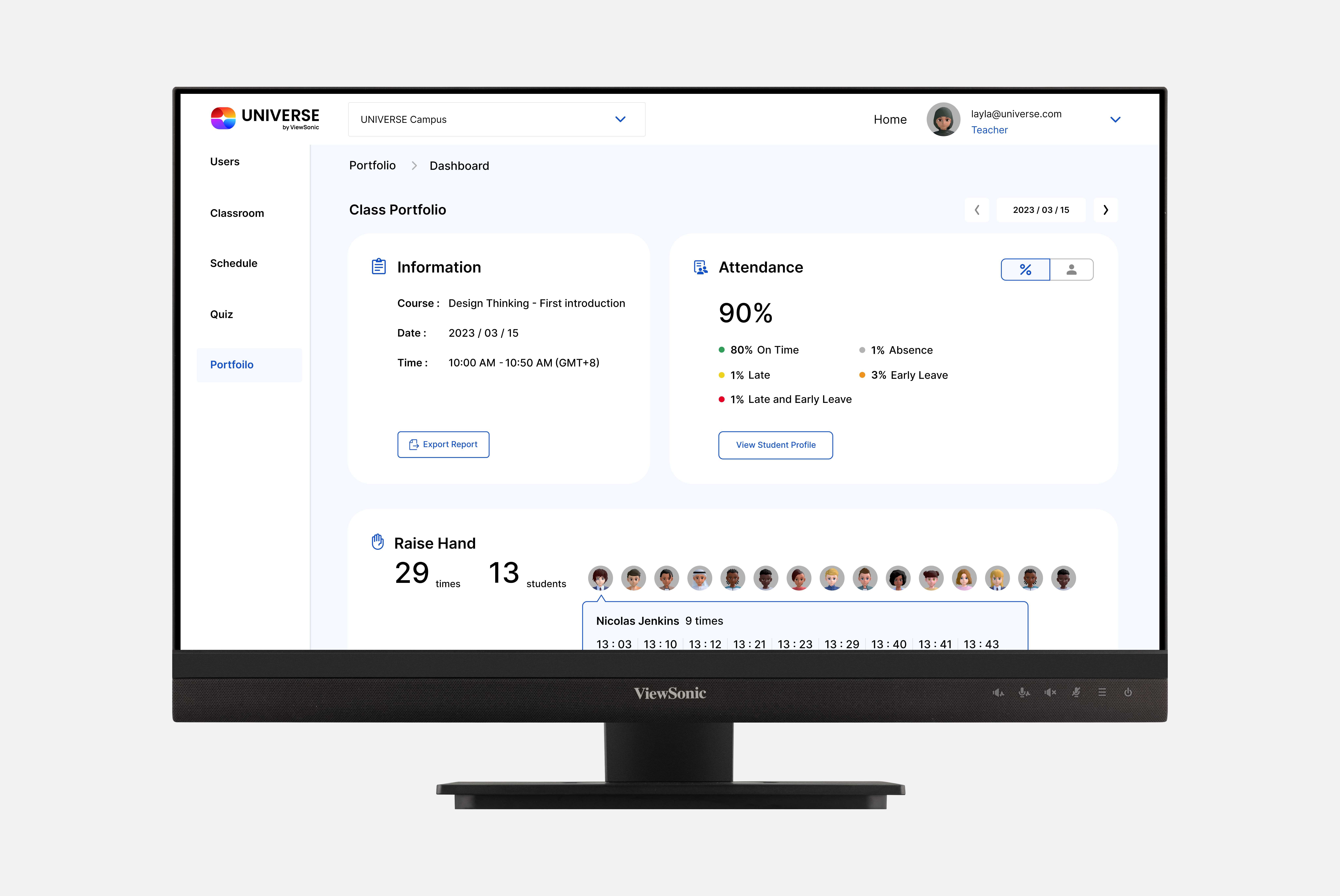 Součástí virtuálního světa společnosti ViewSonic se stal i nástroj Portfolio, který umožňuje učitelům snadný přístup k informacím o třídě, jako jsou výsledky testů, docházka a záznamy o pozdějších příchodech a dřívějších odchodech, a zefektivňuje tak správu třídy.