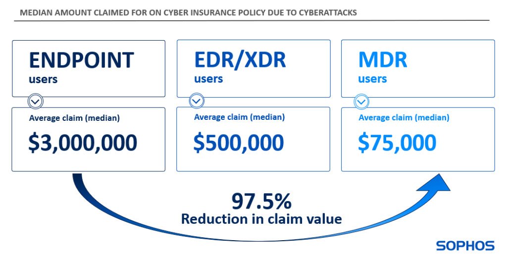 Organizace, které využívají služby MDR, požadují o 97,5 % méně než ty, které se spoléhají pouze na ochranu koncových bodů:Průzkum odhalil, že medián hodnoty pojistného plnění u organizací využívajících služby MDR je o 97,5 % nižší než u uživatelů ochrany koncových bodů. Průměrná (mediánová) výše škody uživatelů MDR činila jen 75 000 dolarů ve srovnání se třemi miliony dolarů u uživatelů ochrany koncových bodů. Jinak řečeno, uživatelé ochrany koncových bodů obvykle uplatňují 40× vyšší nároky na náhradu škody způsobenou kybernetickými útoky než uživatelé MDR. Nižší hodnota pojistného plnění pravděpodobně odráží schopnost služby MDR rychle odhalit a neutralizovat škodlivou aktivitu a zastavit útočníky dříve, než dojde k vážným škodám.