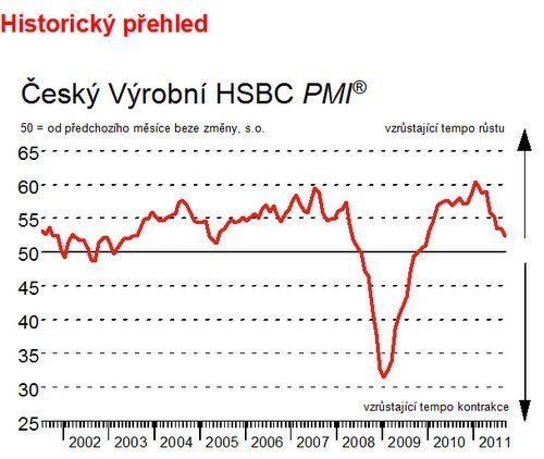 Hlavní Výrobní PMI pro Českou republiku od HSBC je kompozitní jednociferný ukazatel celkového výkonu ve výrobním sektoru, který sleduje změny objemu nových zakázek, ve výrobě, zaměstnanosti, výkonnosti dodavatelů a skladových zásobách. Hodnoty nad 50 bodů poukazují na všeobecné zlepšení podnikatelských podmínek.