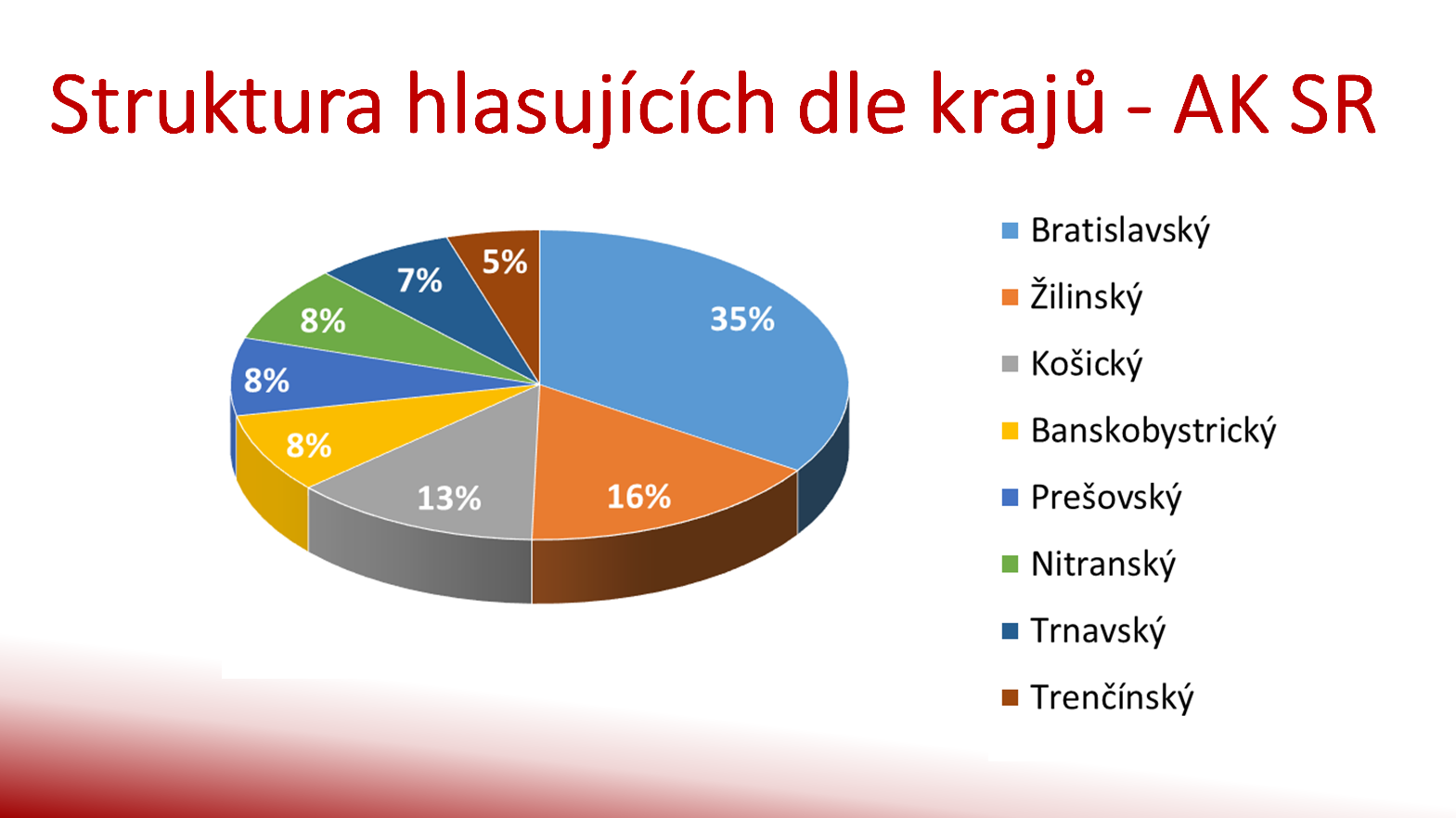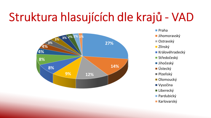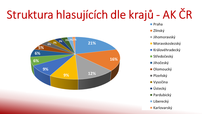 Největší počet hlasujících pocházel z Prahy (21 %), mezi další nejvíce zastoupené kraje patřily Zlínský kraj (16 %) a Jihomoravský kraj (12 %).
