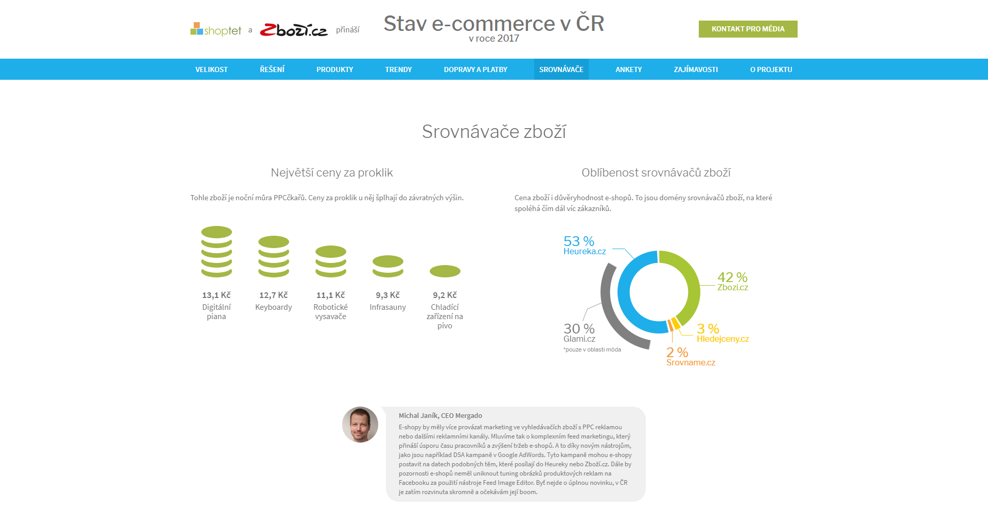 Ceska-ecommerce.cz je unikátním projektem nejen na našem trhu, ale také v mezinárodním měřítku. O kvalitě poskytovaných dat nejlépe vypovídá okolnost, že na řešení od Shoptetu běží více než 12 tisíc, tedy čtvrtina všech českých e-shopů, zatímco Zboží.cz je jedním ze dvou dominantně využívaných srovnávačů cen u nás. Spolu se spuštěním portálu začnou vycházet také pravidelné čtvrtletní zprávy. Stejně jako samotný web poskytnou nejpřehlednější a nejucelenější odhad stavu českého elektronického obchodu u nás.