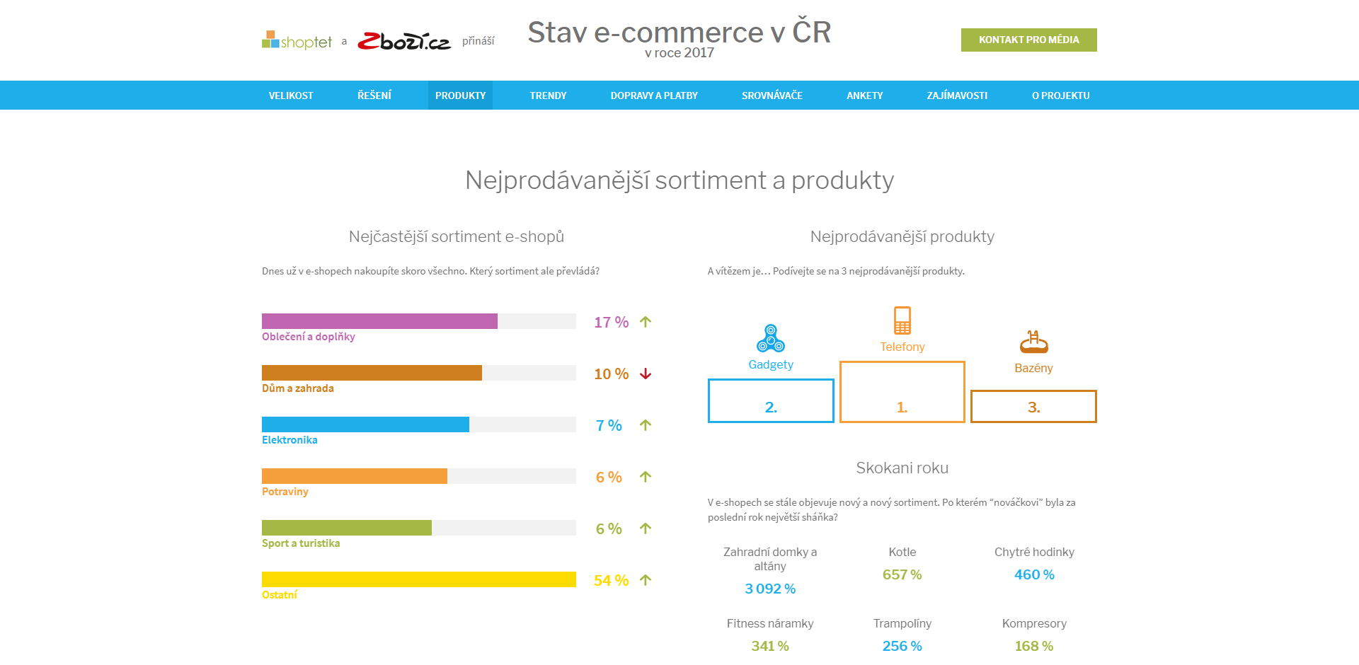 Web tak sleduje i poptávku po jednotlivých kategoriích zboží, třeba že prodej altánů a zahradních domků meziročně narostl o 3 042 %. Poskytuje také přehled o používaných technologických řešeních či procentuální přehled zařízení, ze kterých lidé nakupují. Zajímavý je kupříkladu vývoj preferovaných způsobů platby, mezi nimiž dominuje dobírka a hrazení bankovním převodem (v obou případech 34 %). Zatímco však podíl „offline“ placení, tedy dobírkou a osobně při vyzvednutí, dlouhodobě klesá, platby převodem a kartou online jsou na vzestupu. Nejčastěji pak bývá doručení zboží svěřeno České poště (43 %) a v pomyslném žebříčku na druhém místě je s velkým odstupem PPL se 14 %. Osobně si lidé zboží vyzvedávají v šesti procentech případů, přičemž toto číslo mírně stoupá.