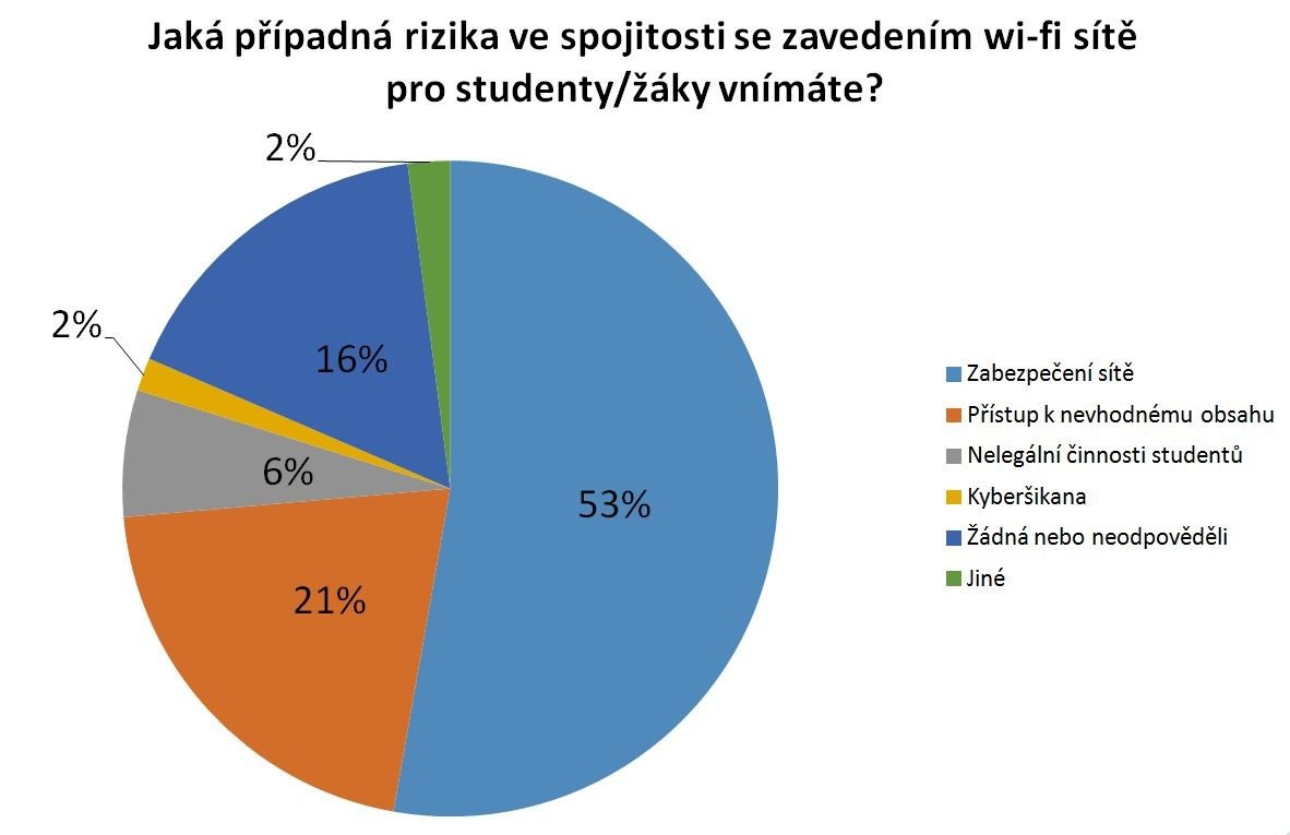 Jako největší problém v souvislosti s nabídkou Wi-Fi pro žáky vnímá většina učitelů zabezpečení sítě před zneužitím. Naopak 15 procent učitelů ve Wi-Fi žádné riziko pro školu či žáky nevidí. Možná překvapivě se pouhá dvě procenta učitelů obávají zneužití připojení ke kyberšikaně, šest procent pak možné nelegální činnosti studentů. Více než pětina respondentů se obává možného zpřístupnění nevhodného obsahu žákům.